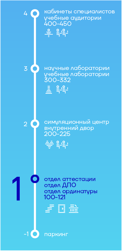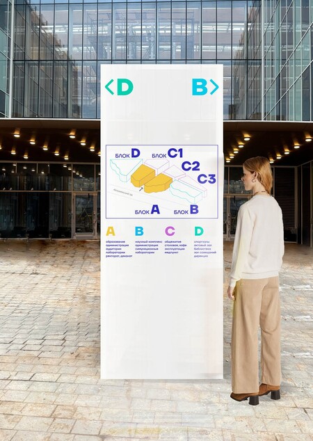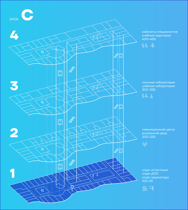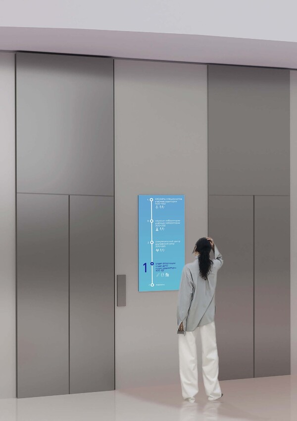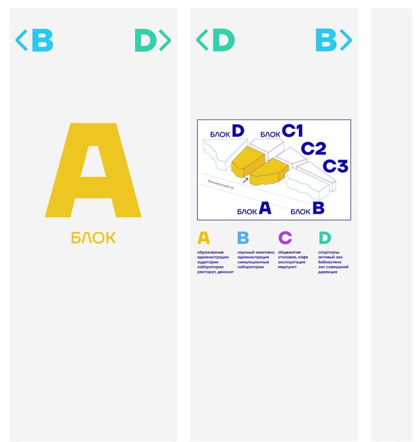 Концепция навигации отражает современность, легкость материалов нового корпуса через градиентные оттенки цветов, а также технологичность и строгость архитектуры с помощью четких линий пиктограмм.