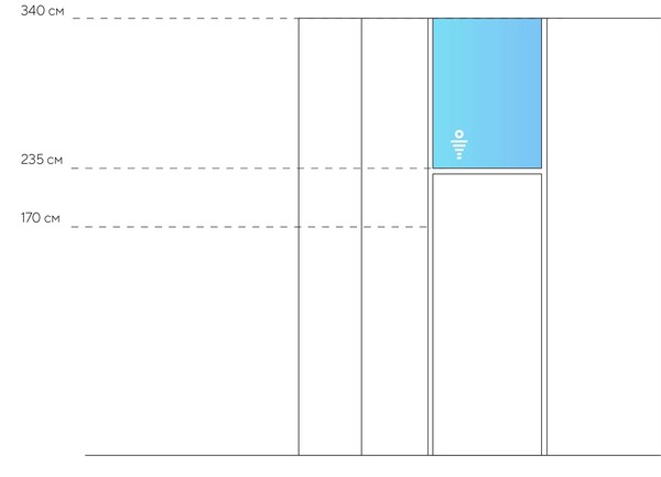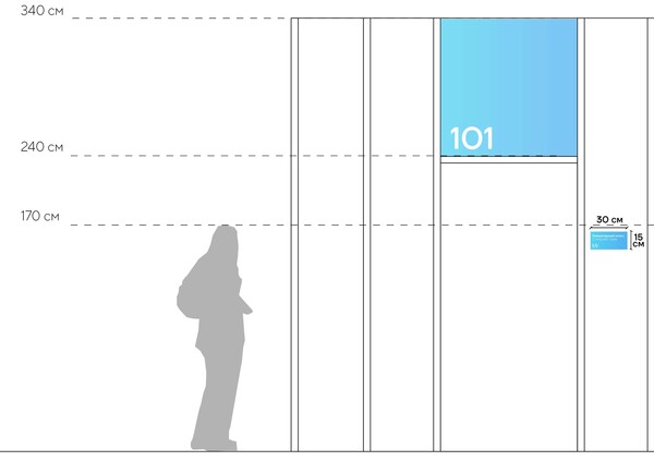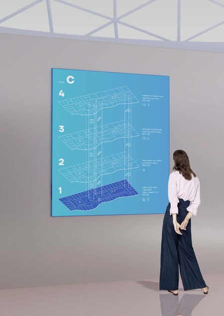 Располагается в вестибюле на каждом этаже за лифтами. Размер 1800×2000мм. Материал: пластик, матовая пленка (плоттерная резка).