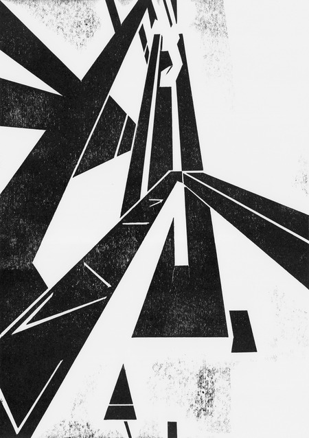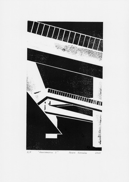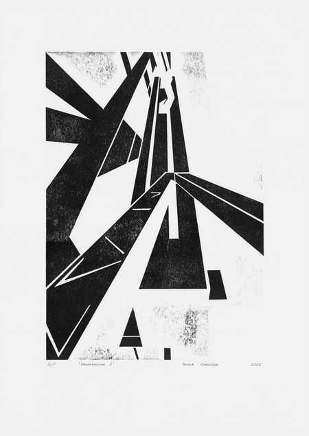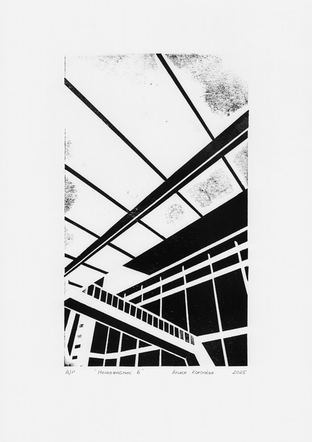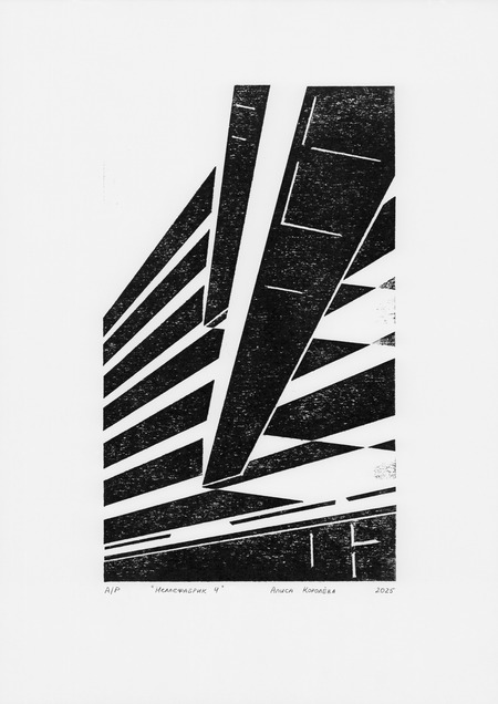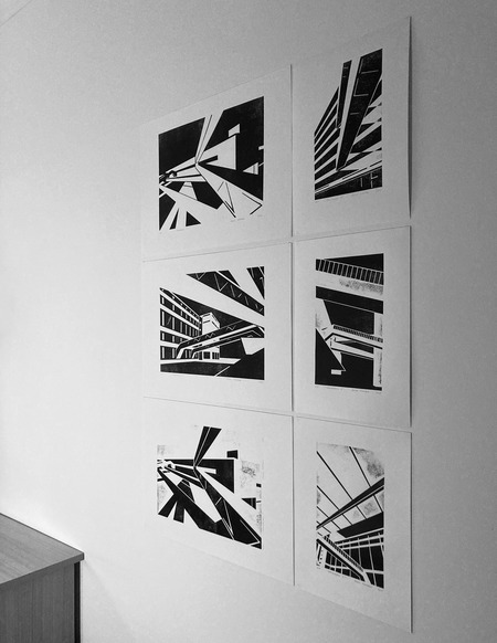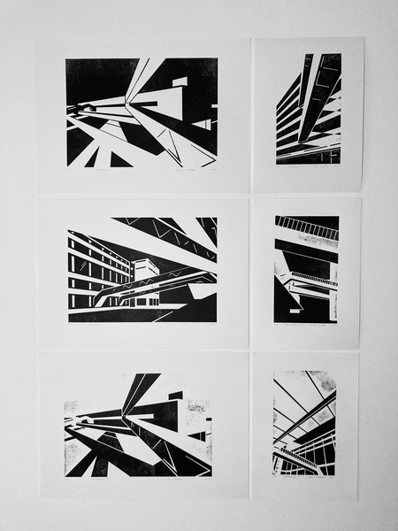 Рассматривая архитектуру завода, я обнаружила интересные геометрические композиции. Многие из них были выразительны благодаря контрформам, образованным разнонаправленными галереями, в которых ранее располагались конвейеры. Я решила создать серию работ с фрагментами здания, используя технику гравюры на картоне. Этот материал позволил получить неоднородный по текстуре оттиск, что усилило индустриальный характер серии.