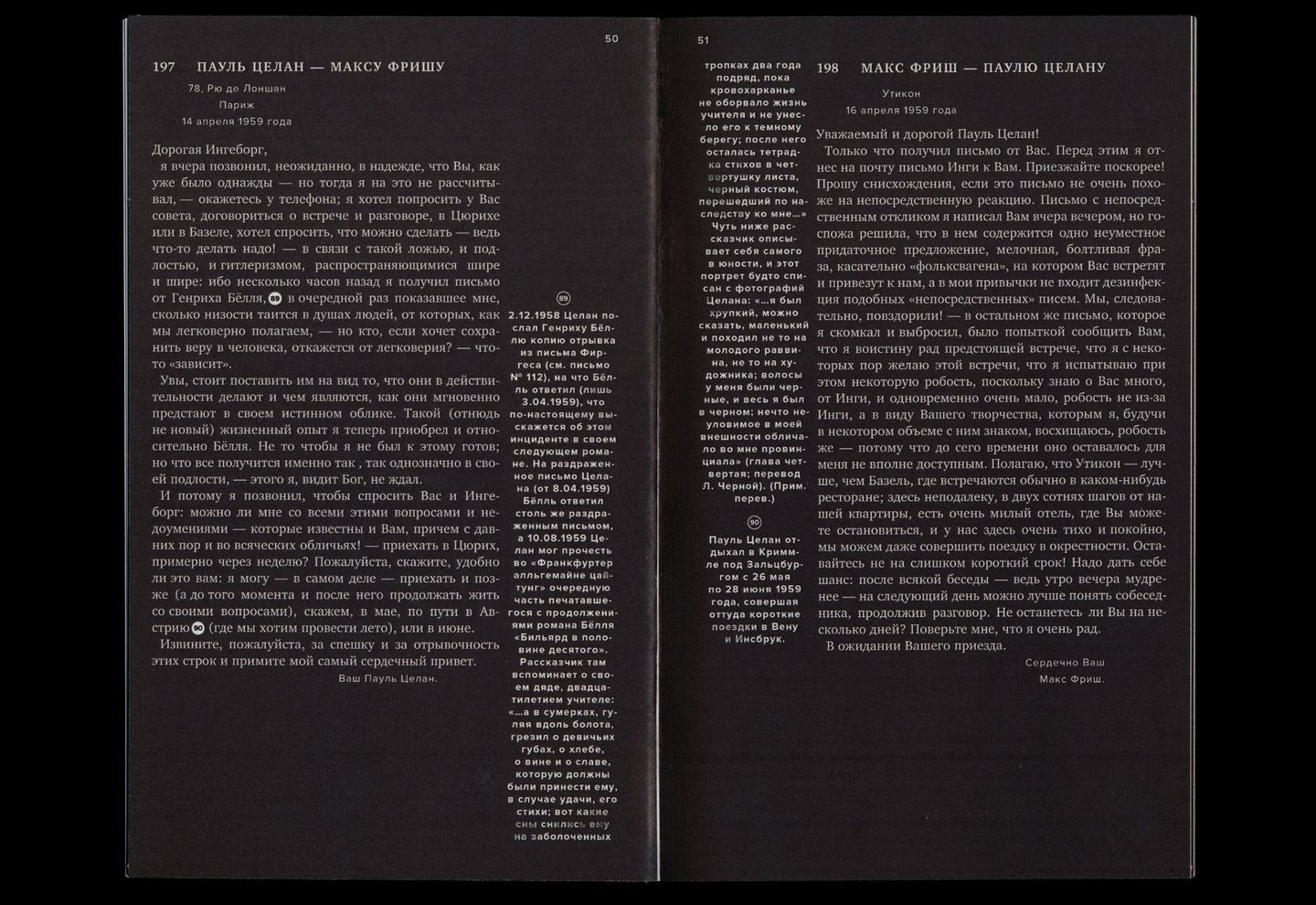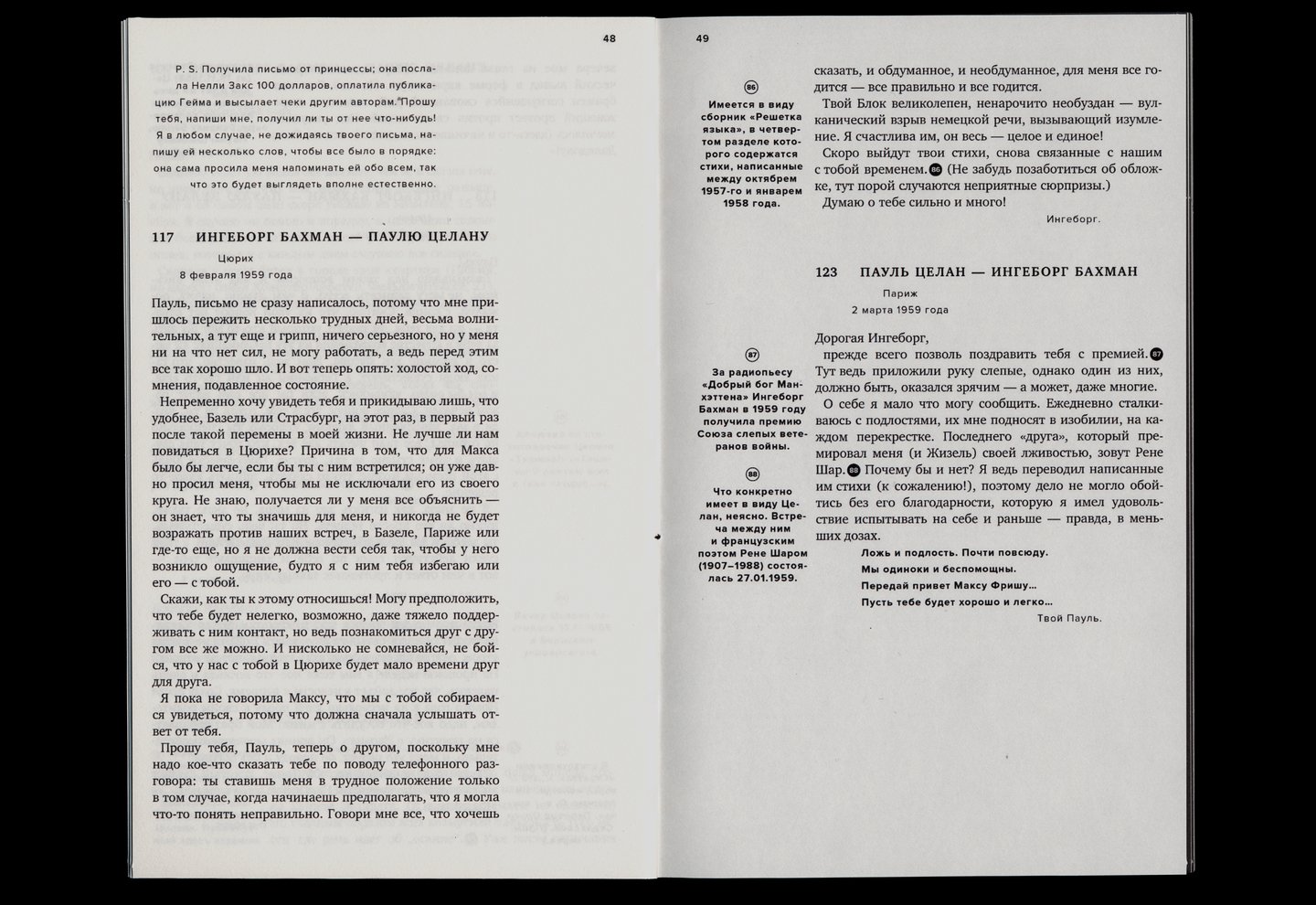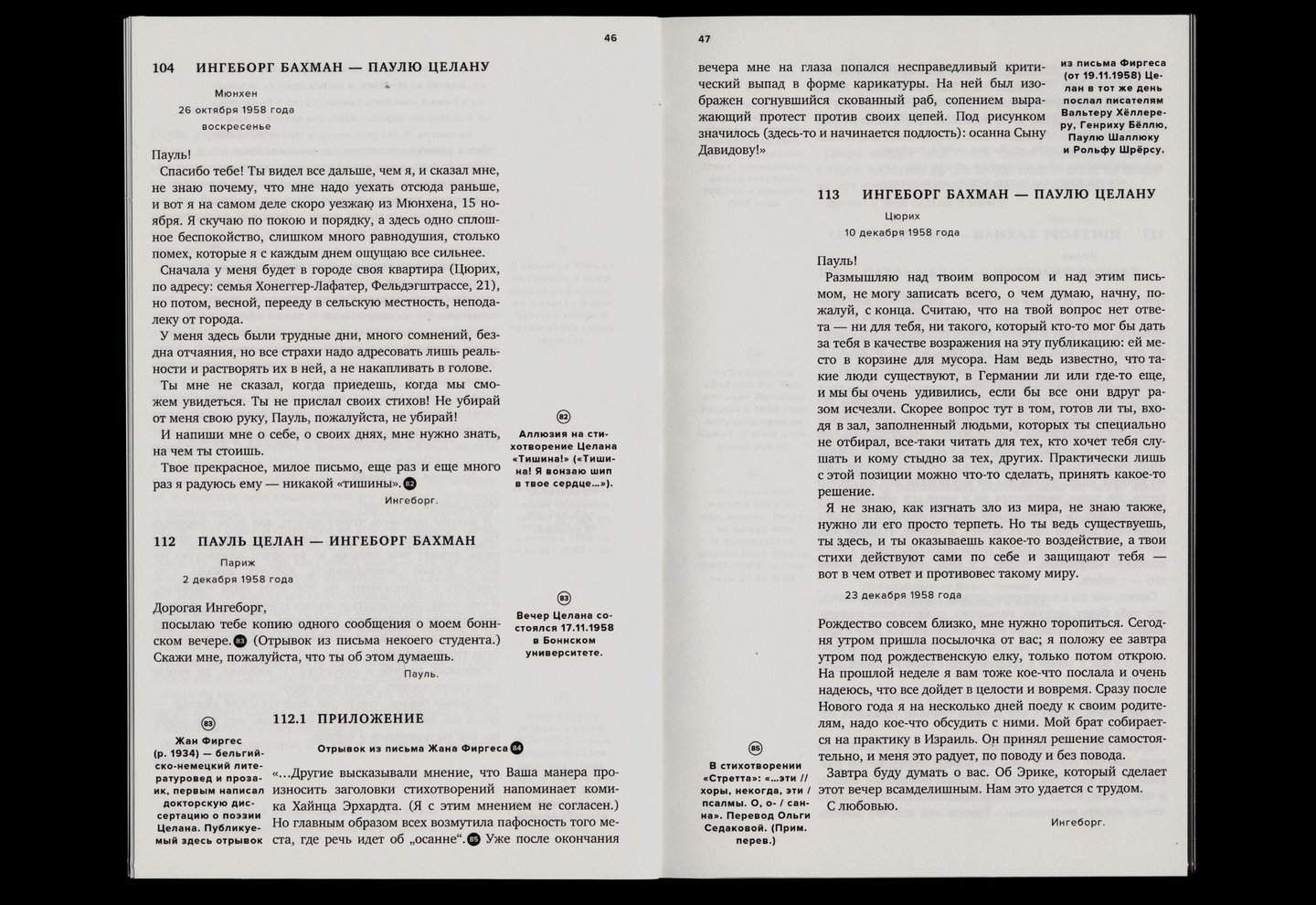 Издание выстроено вокруг неполной переписки австрийской писательницы Ингеборг Бахман и немецкоязычного поэта Пауля Целана.