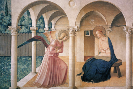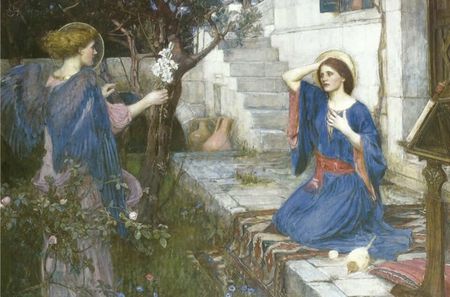 1. Фра Анджелико, «Благовещение» (ок. 1430), 2. Джон Уильям Уотерхаус, «Благовещение» (1914).