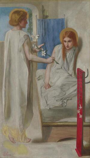 1. Мария представлена в тесном пространстве, будто напуганная и растерянная. Лилии в руках ангела символизируют чистоту, но её взгляд передаёт человеческий страх перед божественным. Россетти показывает не иконный образ, а живую девушку, впервые осознавшую свою судьбу.