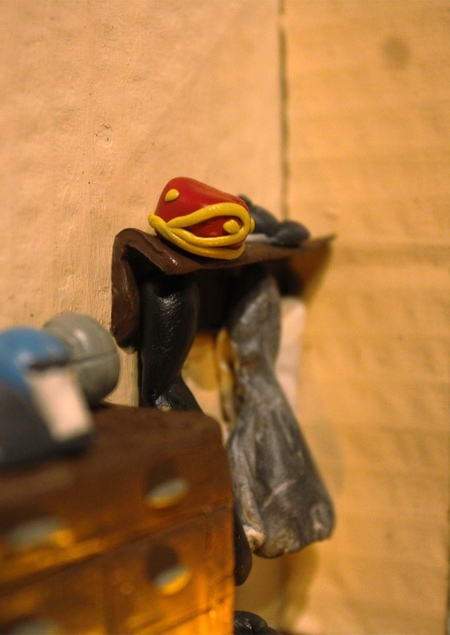 Материалы: картонные коробки, в которых жильцы перевозили вещи, и пластилин. Картон — простота, доступность, функциональность — характерные черты общежитий. Картон недолговечный материал, как картонная конструкция может легко потерять форму или развалиться, так и сам уклад жизни в общежитии постоянно деформируется и находится на грани. Пластилин — мягкий, легко трансформируемый материал, как и жизнь в условиях коллективного сожительства гибкая — каждый вносит свои детали в существующий порядок. Окрашено краской для общажных стен.