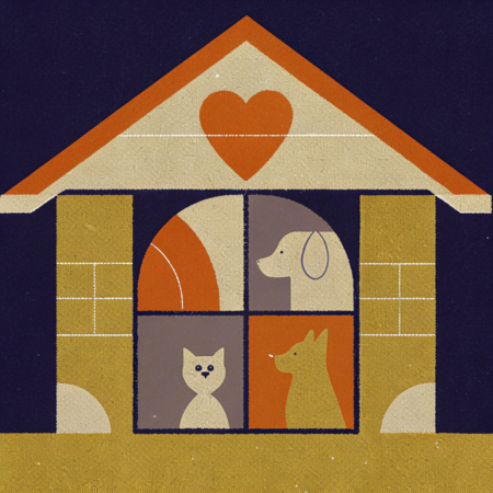 Main idea: Flat vector illustration of a cozy house at night, viewed from the front. A cat, a dog, and a flower in the windows. There’s a heart under the roof of the house. textured paper effect, symmetrical composition, warm and comforting atmosphere.