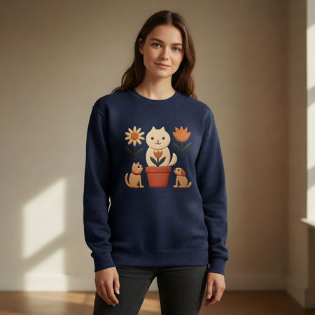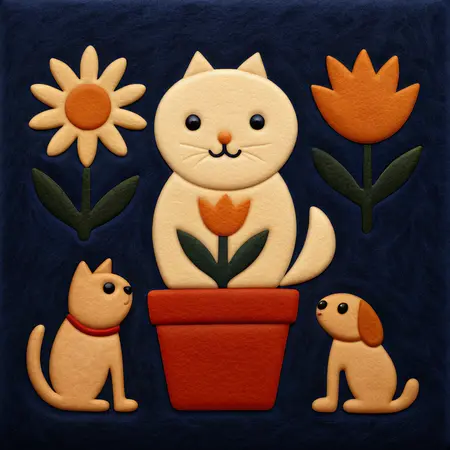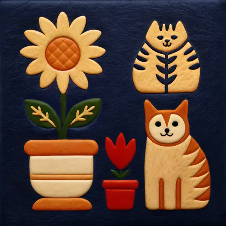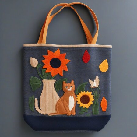 Промт для Stable Diffusion XL: Photorealistic image of a woolen tote bag with a dark navy blue textured background. The bag features a charming, raised 3D appliqué pattern in warm earthy tones: a large sunflower with yellow petals and an orange quilted center in a beige pot with green leaves; a small red tulip in a red pot; and two stylized cats — one sitting upright with an orange and cream striped body, the other smaller cat with a leaf-patterned sweater. All elements are crafted to look like soft, sculpted felt or wool, with visible stitching and gentle shadows giving them depth. The overall style is cozy, handmade, and whimsical, reminiscent of Scandinavian folk art. Soft studio lighting, shallow depth of field, close-up shot