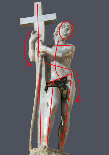 Христос здесь победитель, преодолевающий смерть, а не мученик, поэтому лицо его спокойно. Микеланджело сознательно создаёт Христа как нового Геракла. Он переносит в христианский контекст античный идеал «героя-победителя», причём делает это через пластику тела.