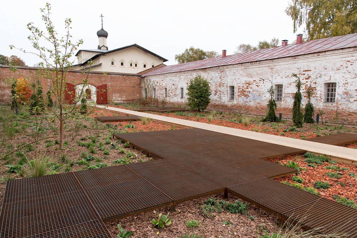 Не менее интересным проектом можно назвать благоустройство территории Спасо-Евфимиево монастыря в Суздале. Здесь команда бюро «МОХ» десакрализирует часть пространства монастыря, делая его более доступным для всех желающих. Это замечательный пример озеленения, функция которого заключается в расширении горизонтов для нерелигиозных посетителей города и в большем привлечении внимания к сакральным объектам культуры. Стоит отметить, что реализованный проект можно считать новым культурным местом для прогулок, появившийся маршрут отличается от любых других в городе, что способствует притоку не только туристов, но и заинтересованных местных жителей.