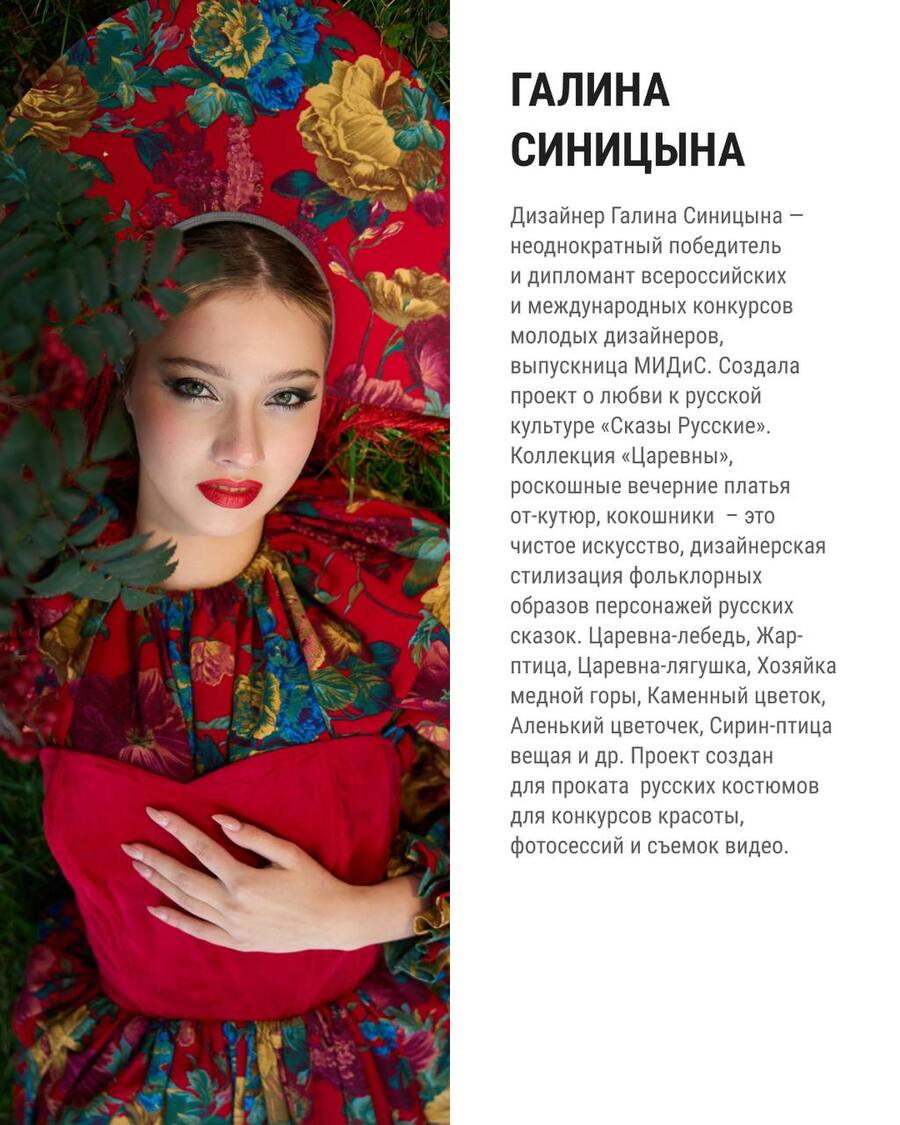 К истокам, русской истории и культуре обратились многие дизайнеры-участники показа. Так, Галина Синицына посвятила свою коллекцию «Царевны» персонажам русских сказок и сказов. Коллекцию Марии Токаревой (бренд «Маруся Боярова») можно было узнать по авторскому стилю — в своих работах она использует вручную вязанное кружево. Современную адаптацию русского культурного кода («славянский гранж») представил бренд из Екатеринбурга Beautiful Criminals. Коллекция «Аркаим», созданная преподавателями и студентами Международного института дизайна и сервиса, возвращает зрителей к тысячелетней истории Южного Урала.