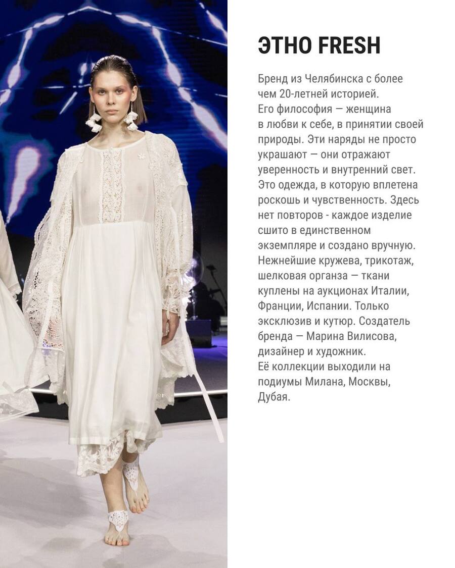 Зрители увидели коллекции: Софии Енидунаевой, Галины Синицыной, Маруси Бояровой, Татьяны Котовой, Валентины Рыбак, 2SIDES, ЭТНОfresh. Коллекцию «Аркаим» под авторскую музыкальную композицию представят студенты МИДиС. Еще два бренда — BEAUTIFUL CRIMINALS и BIG BROOCH — представляют Екатеринбург.