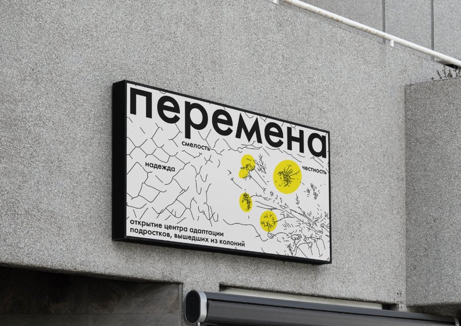 Prompt: A realistic city street mockup with a large framed poster mounted on a stone building facade. The poster is shown straight-on, centered in the frame, professionally lit. The design inside the frame is a modern graphic poster with a white top half and a yellow bottom half, black minimalist typography, and an abstract cracked geometric symbol in the center. The title on the poster reads «Peremena» with a subtitle about a rehabilitation and adaptation center for teenagers transitioning from juvenile detention. People walking in the background, out of focus, not drawing attention. High realism, professional advertising mockup, clean, editorial, premium look. Focus on the poster, shallow depth of field, realistic materials and shadows.