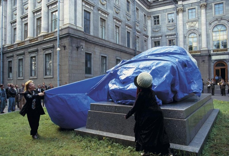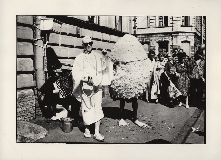 На фото слева: Объединение «Тут-и-Там», акция «Оперение Медного Всадника», 1994 [11]