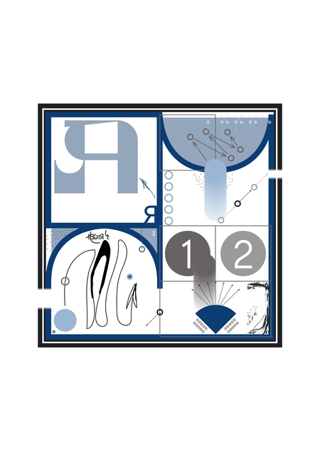 Платок «о2» — визуализация поиска причинно-следственных связей в обыденности. Он является частью серии из восьми векторных композиций, дополненных абстрактными пятнами туши, напечатанных на ткани.