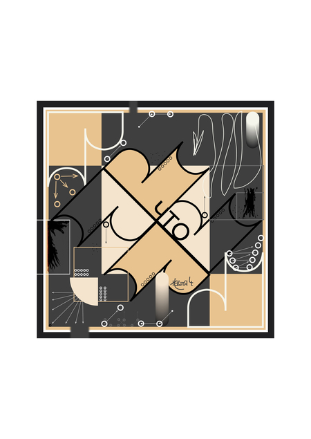 Платок «о1» — визуализация поиска причинно-следственных связей в обыденности. Он является частью серии из восьми векторных композиций, дополненных абстрактными пятнами туши, напечатанных на ткани.