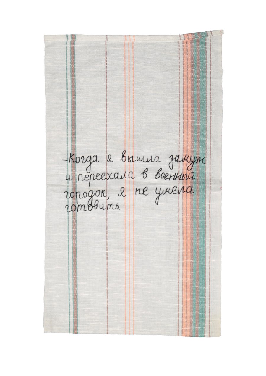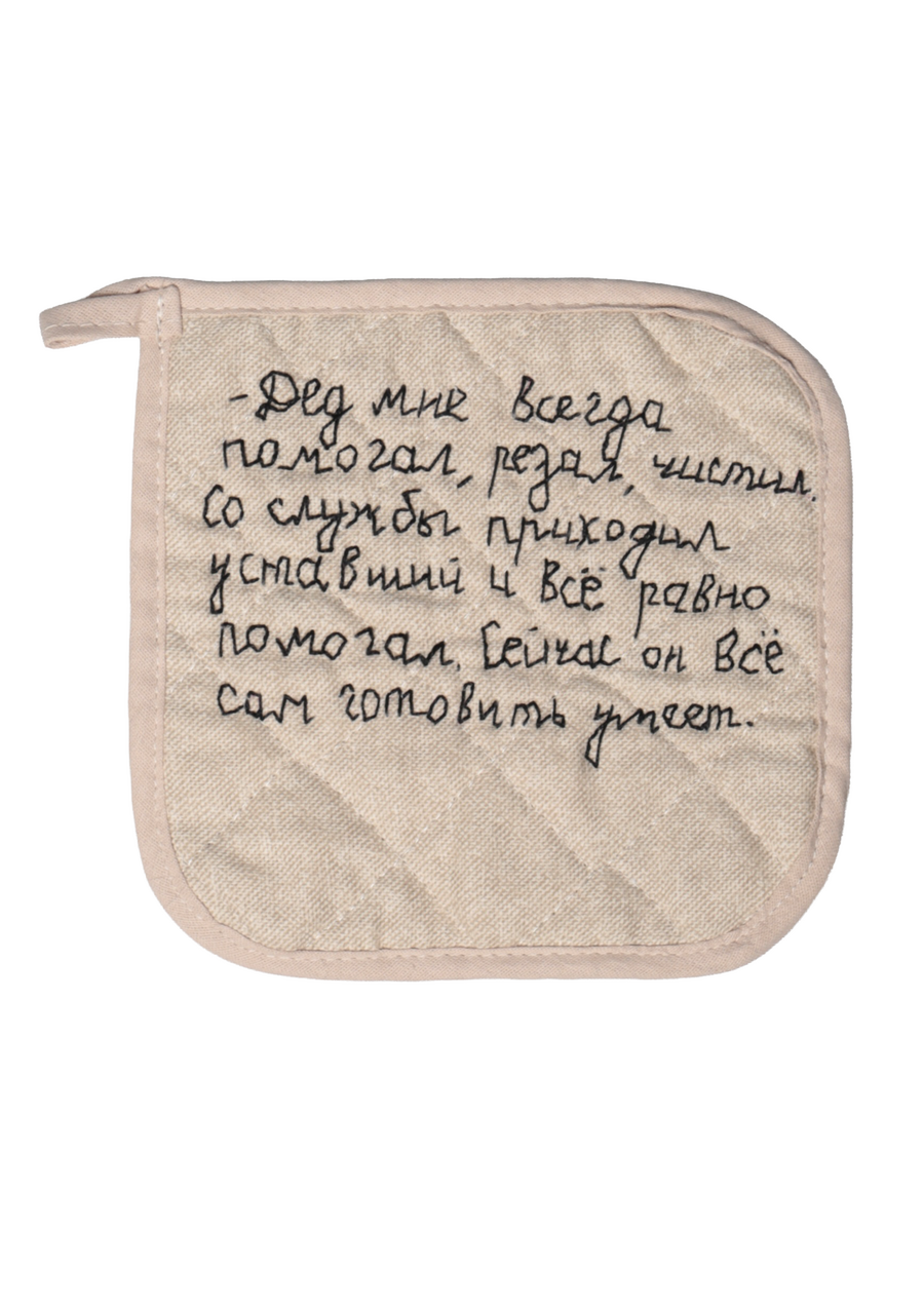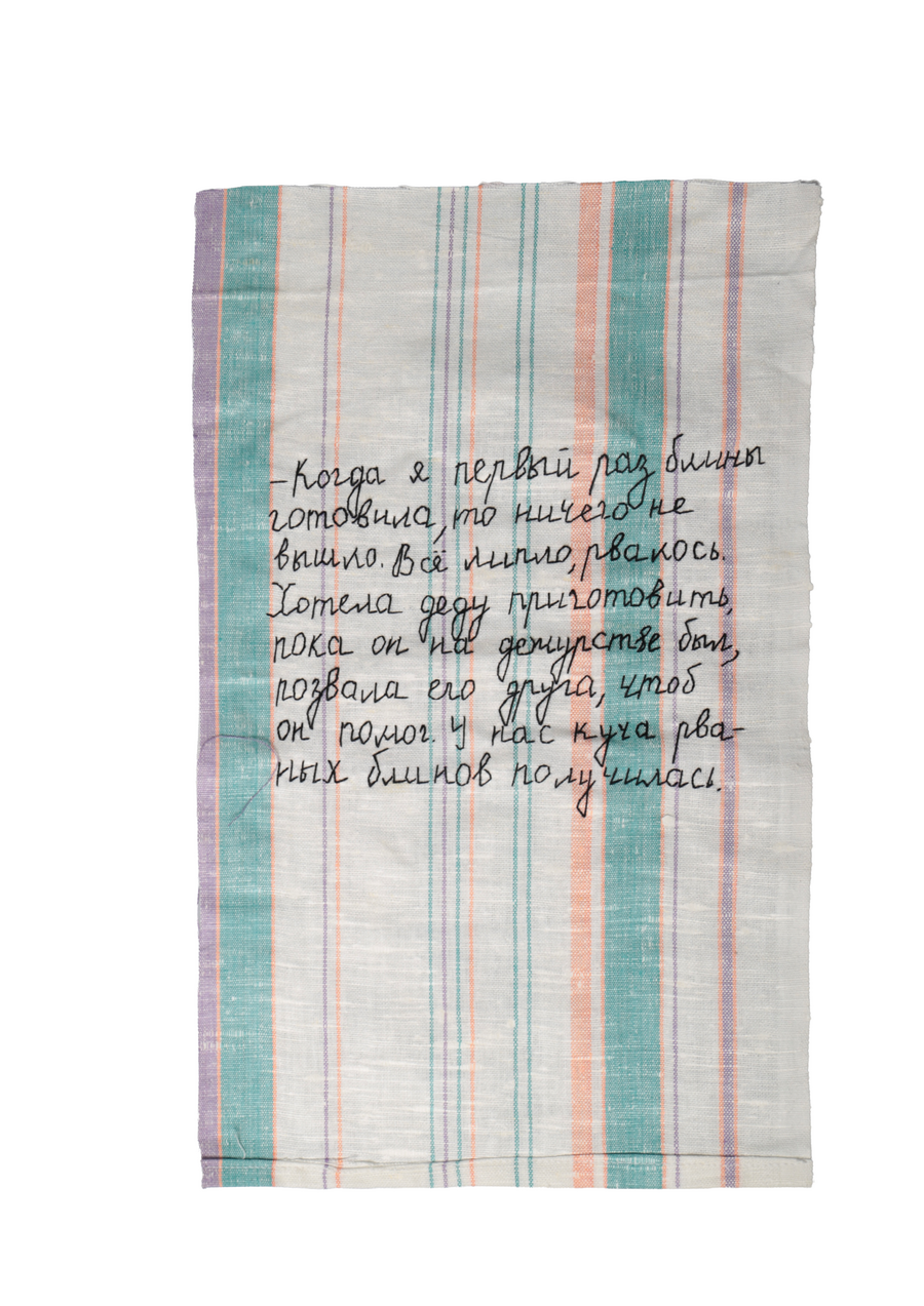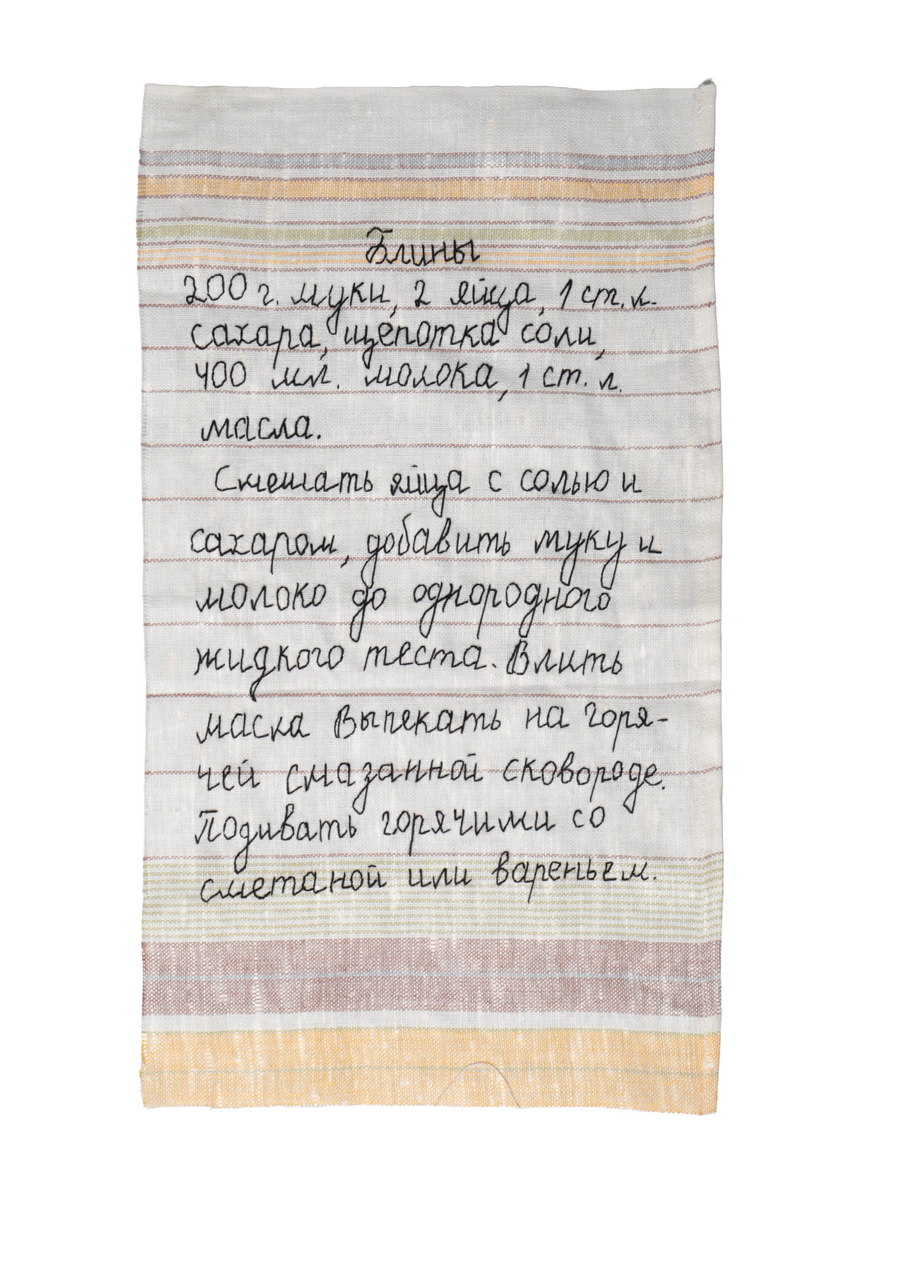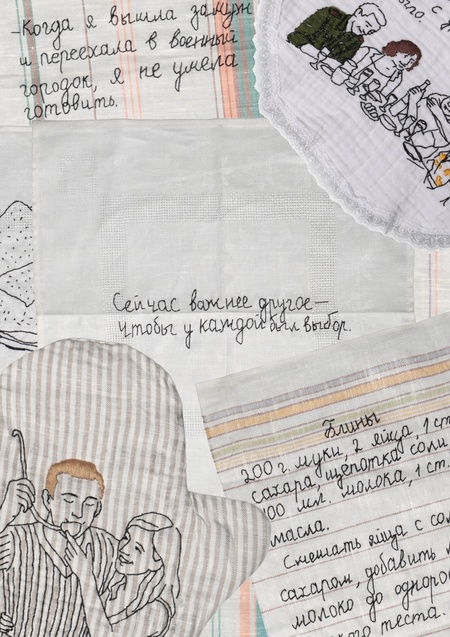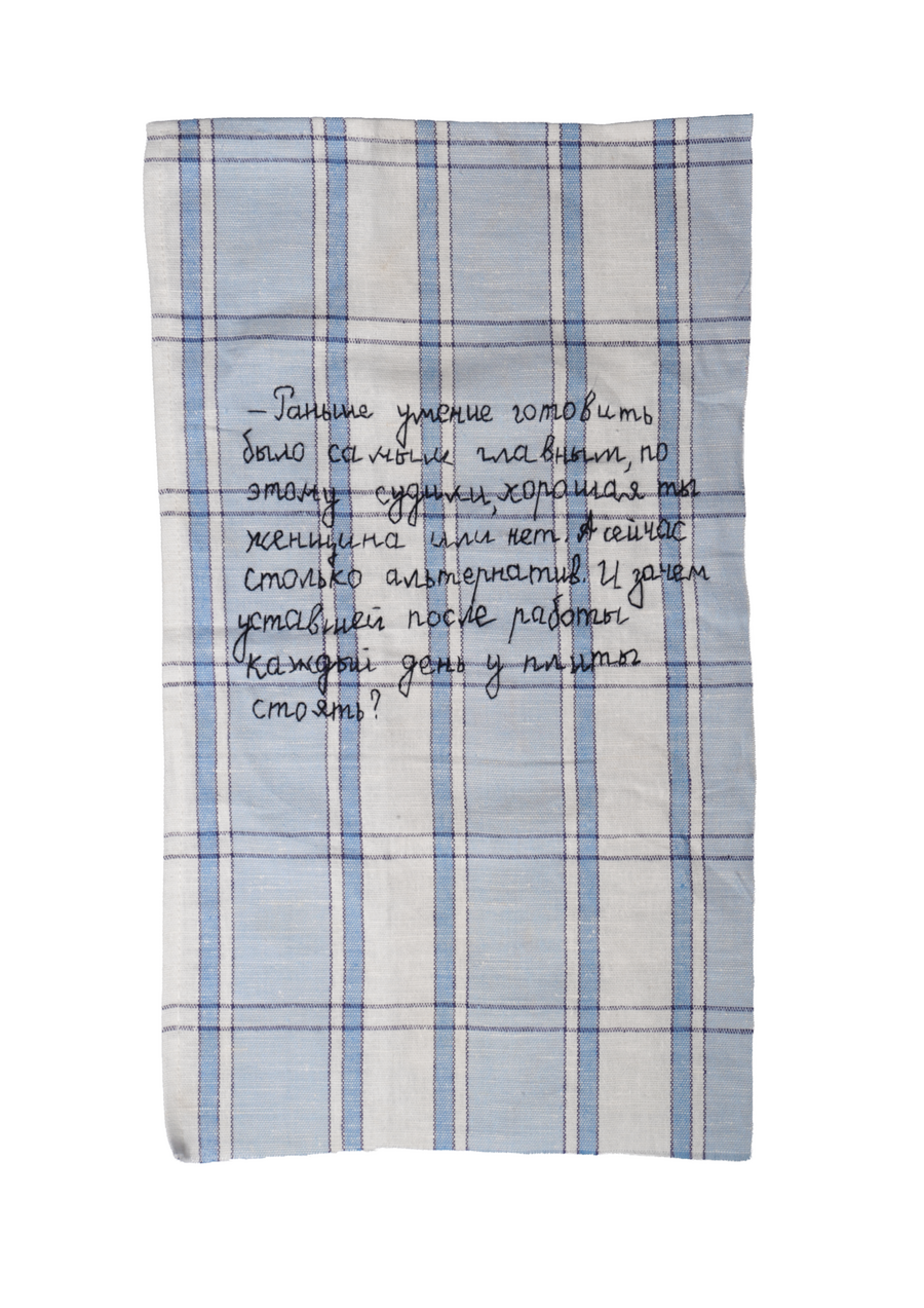 Я рассматриваю приготовление пищи как метафору женской роли не в абстрактном смысле, а через конкретную семейную историю. Разговоры с бабушкой позволяют мне увидеть, как эта норма реализовывалась в её жизни и как со временем внутри неё самой появляется дистанция по отношению к прежним ожиданиям. Для её поколения совмещение работы и домашнего труда было естественным и неизбежным, но в её словах всё чаще звучит признание права женщины решать самой, как и в какой мере участвовать в этом сценарии. Я фиксирую этот сдвиг и своё собственное отношение к нему. Материалы книги работают как часть высказывания. Кухонный текстиль — полотенца, салфетки, прихватки — связан с повседневным, незаметным женским трудом. Используя эти материалы, я перевожу то, что обычно остаётся фоном, в зону видимости и размышления.