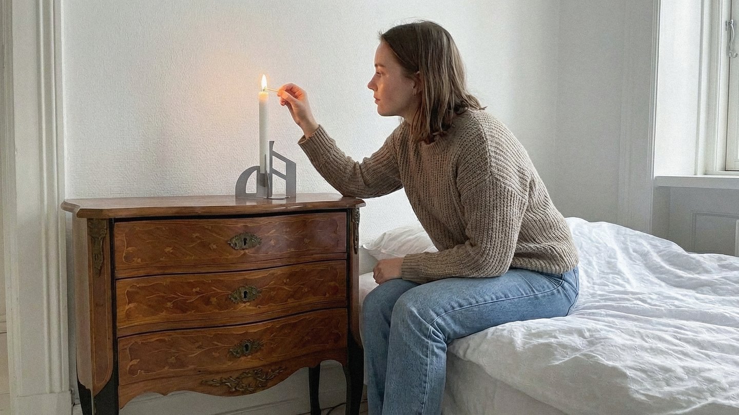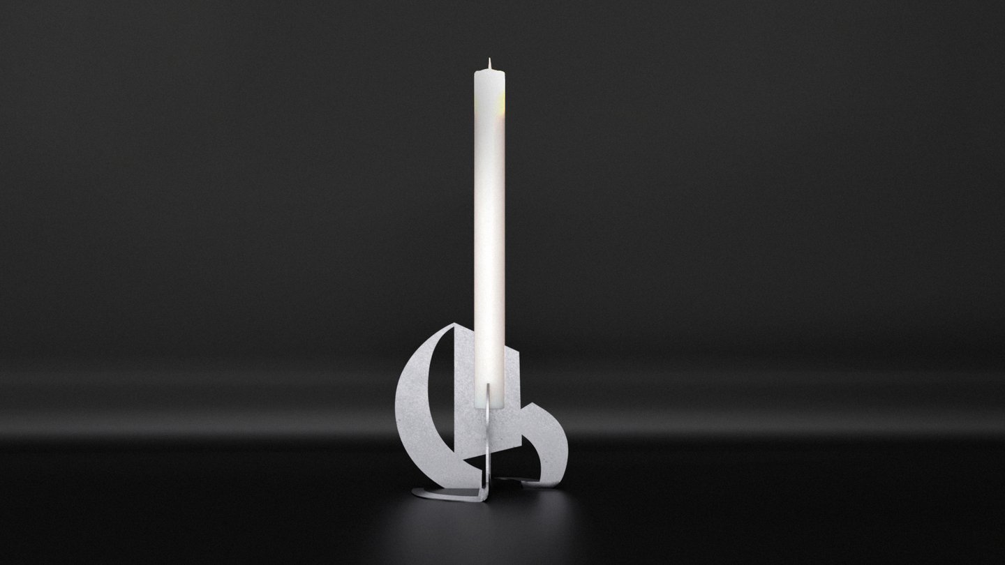 На основе шрифта разработан подсвечник, состоящий из двух лопостей, каждая из которых повторяет пластику одного из крайних начертаний: сyrillic и blackletter. На их пересечении ставится свеча: огонь на ней постоянно меняет свою форму, перекликается с начертанием medium. Важным становится и взаимодействие штрихов европейской готики и русского устава.