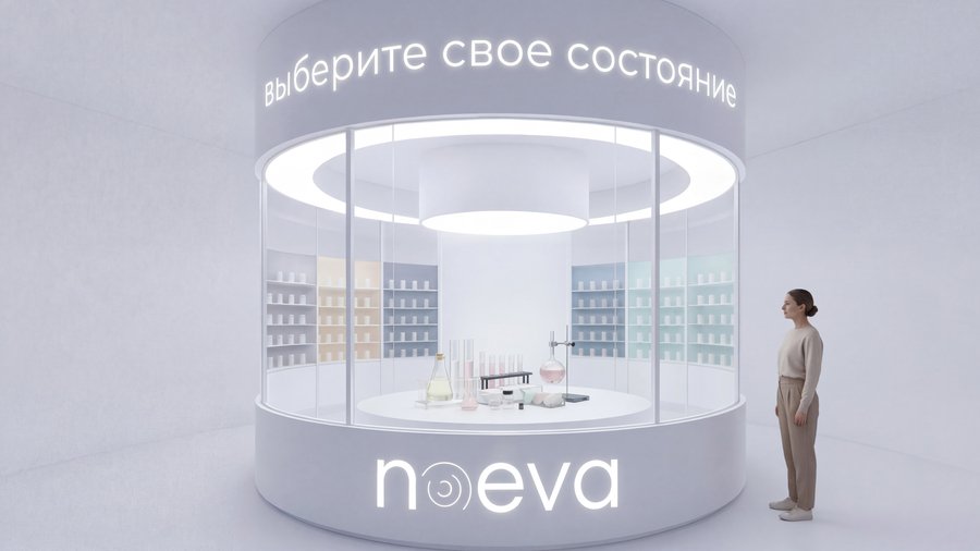 Pop-up станция бренда трансдермальных пластырей Noeva выглядит как мини-лаборатория с элементами кастомизации, где человек выбирает пластыри, собирает персональный сет и погружается в атмосферу медицинской экспертизы, усиливающей доверие к бренду