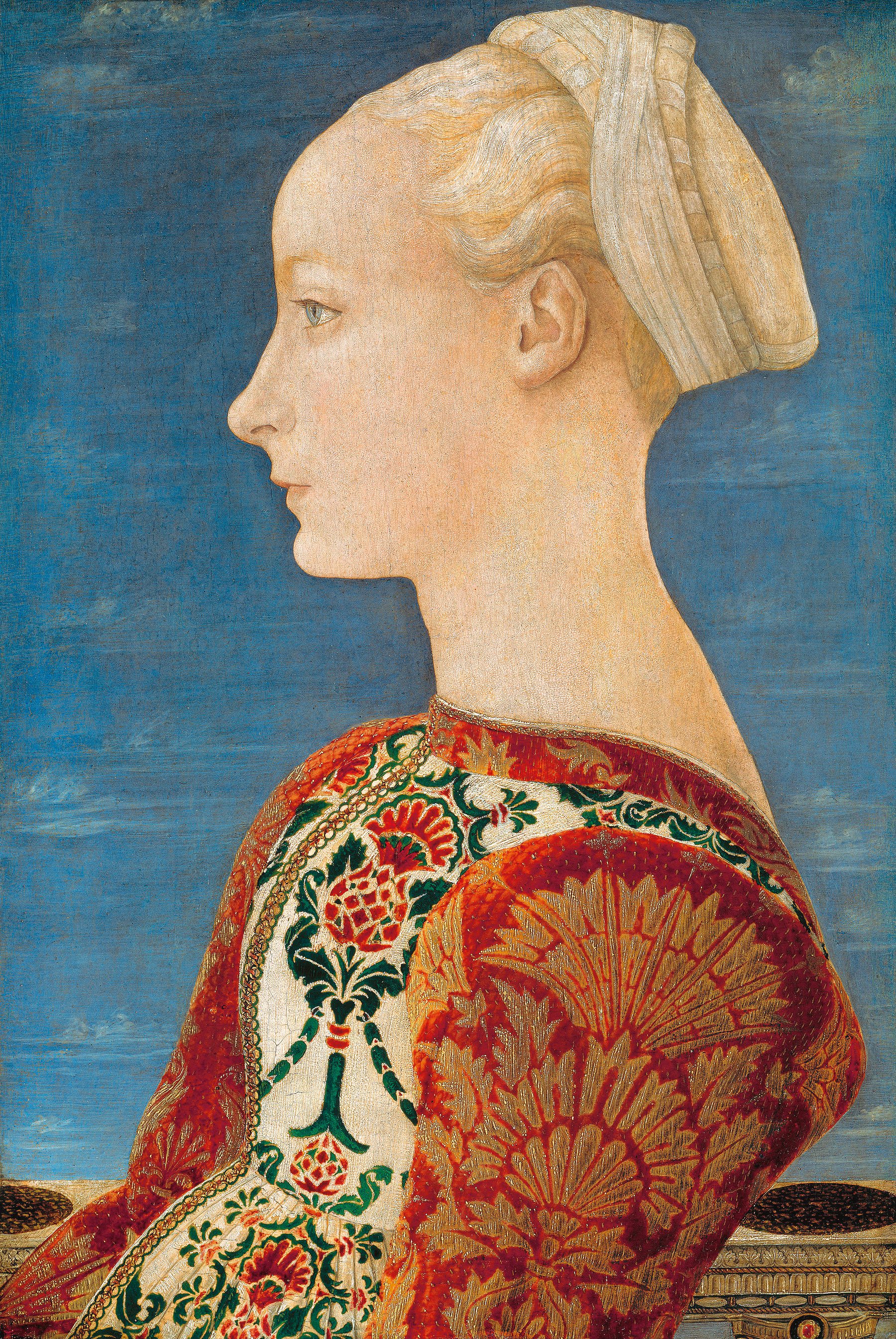 «Портрет молодой дамы в профиль», авторство которого приписывается Антонио дель Поллайоло или его брату Пьеро дель Поллайоло (ок. 1465) — один из самых узнаваемых женских поясных портретов раннего Ренессанса в Италии. Холодный голубой фон подчеркивает статуарность лица и шеи, а роскошный парчовый наряд с замысловатой вышивкой заявляет о богатом статусе модели. Сдержанная поза и резкий профиль будто превращают женщину в античный медальон, идеализированный образ эпохи Ренессанса. Здесь нет присущего поздним годам психологизма, но зато присутствует эталон красоты тела и модных веяний времен Медичи.