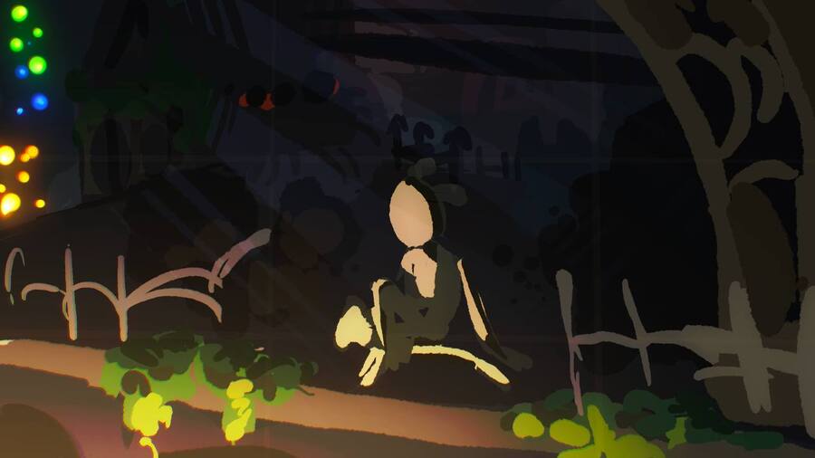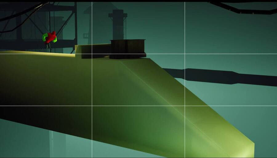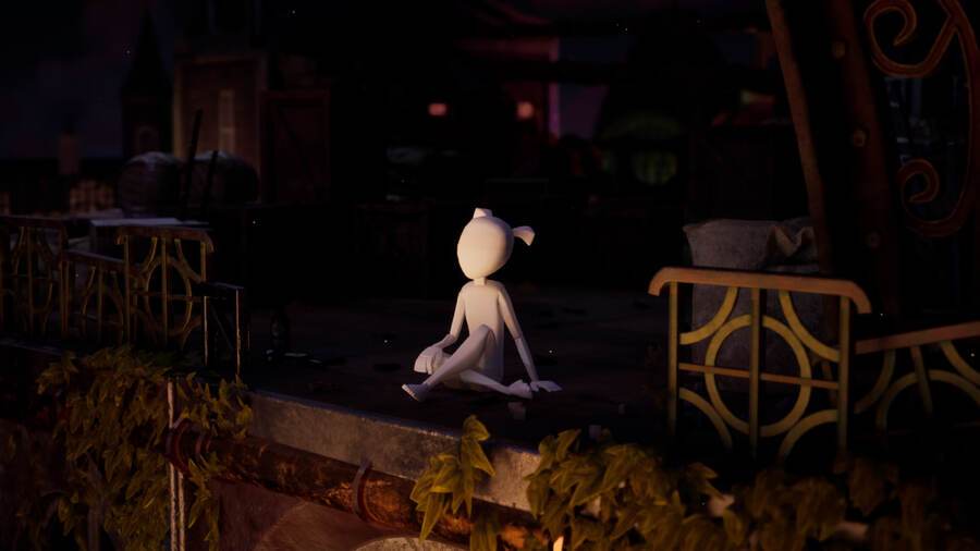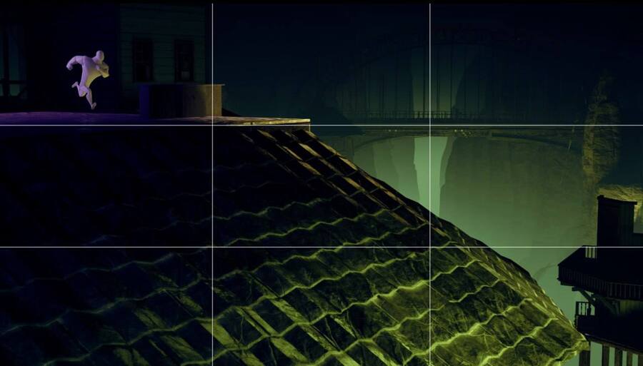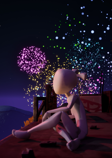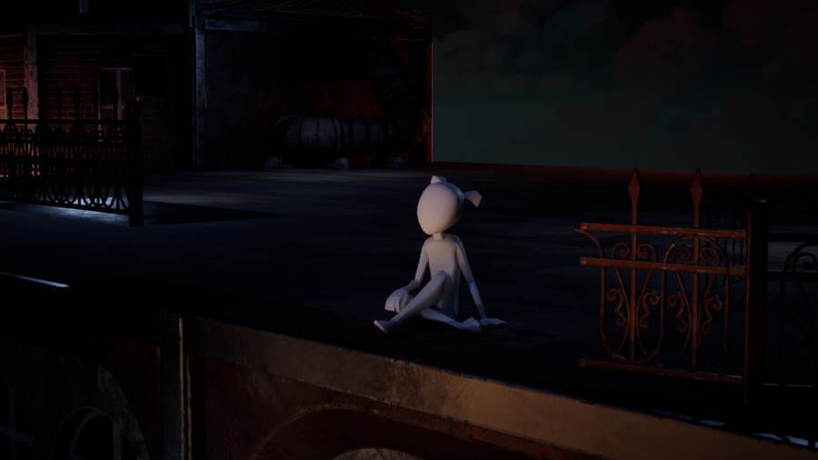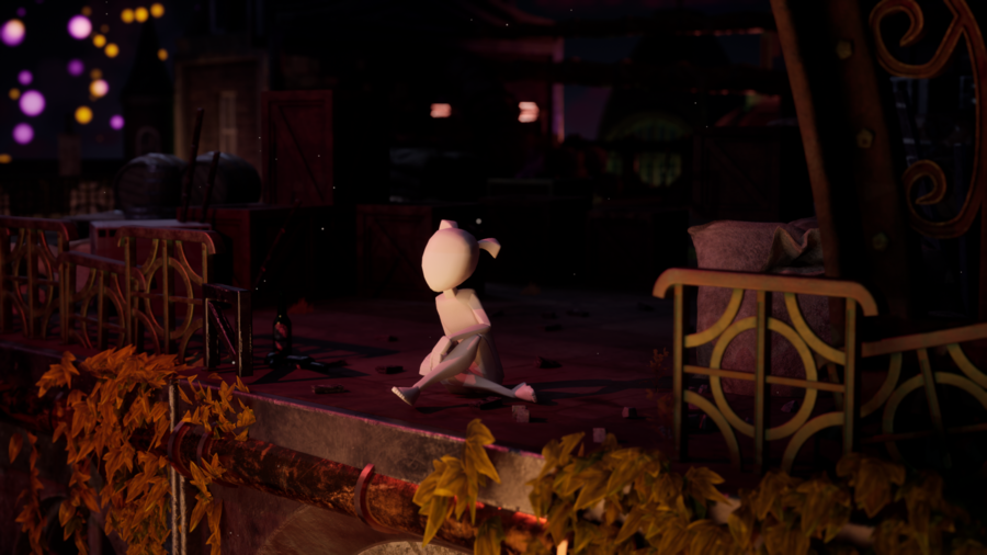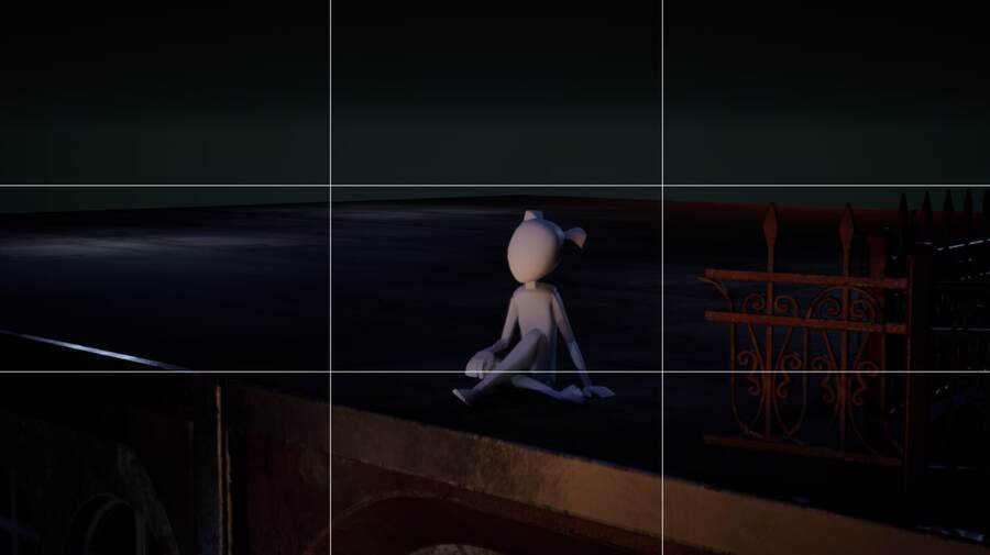 Именно с этой локацией у меня возникло больше всего проблем. Хотелось передать мрачность места, добавить натуральный свет, исходящий из домов снизу, а за спиной героини было бы темное захламлённое пространство. Пришлось несколько раз перестраивать с нуля все здания и пропсы, чтобы добиться приближенно нужного результата. P. S. Только здесь мне пришлось рисовать себе вспомогательную шпаргалку, чтобы понять, как построить нужную композицию.