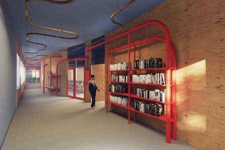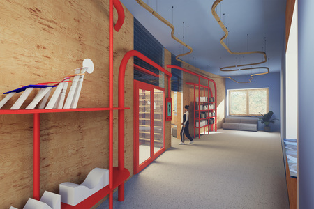 Главной линией концепции проекта учебного кластера является яркая линия труб, проходящая через холл и образовывающая стеллажи, места для вывески учебных работ, расписания и афиш.