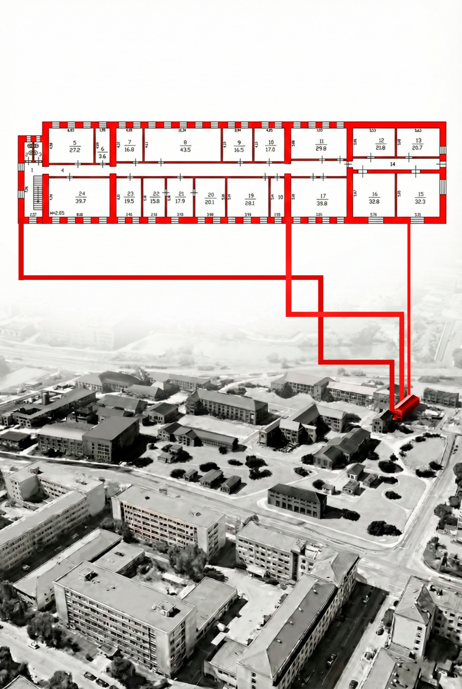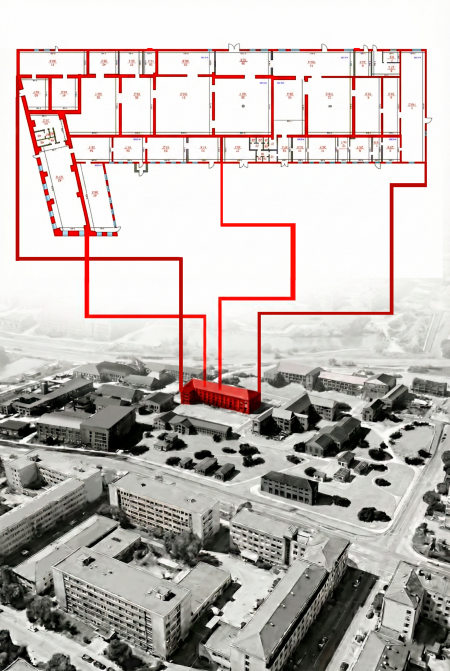 Актуализация данных В связи с переходом объекта в стадию активных строительных работ старая документация утратила актуальность. Геометрия помещений меняется в реальном времени. Сейчас на территории производится полный цикл новых кадастровых обмеров для создания современной цифровой модели и сопутствующего альбома чертежей. Представленные архивные листы используются в проекте как историческая подоснова для анализа несущего каркаса.
