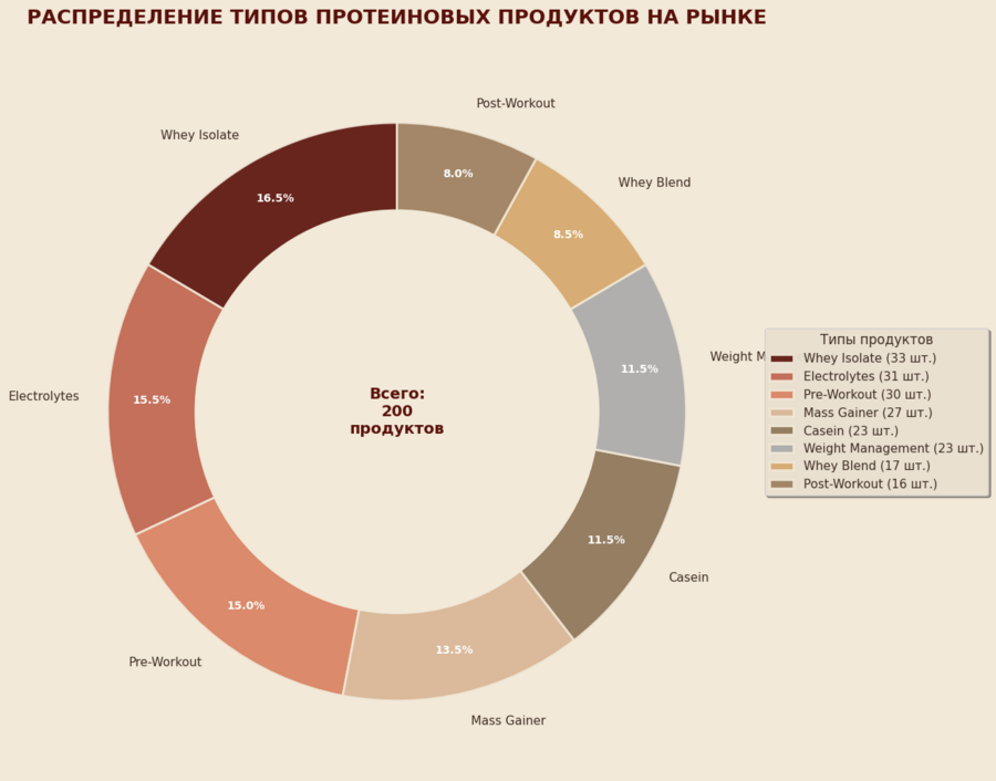 1. Прослеживается чёткая ориентация на цели потребителей. Основные доли занимают продукты для решения конкретных задач: сывороточный протеин и предтренировочные комплексы — для эффективных тренировок, электролиты — для восстановления баланса, гейнеры и продукты для контроля веса — для изменения состава тела. Это означает, что потребитель выбирает не просто добавку, а инструмент под свою конкретную цель.