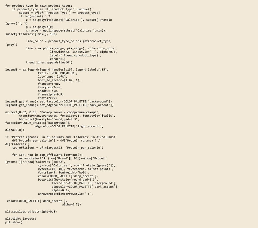 График точечной диаграммы позволяет одновременно анализировать четыре показателя (калории, белок, сахар, тип продукта) для целой группы товаров. Главная задача — выявить зависимости и аномалии на рынке.