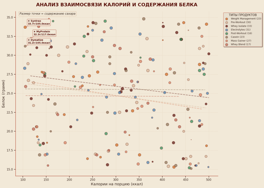 Часто предполагается, что в спортивном питании «много белка = мало всего остального» или «высокое содержание сахара = много углеводов». Матрица позволяет проверить, так ли это на самом деле для среднего рыночного продукта.