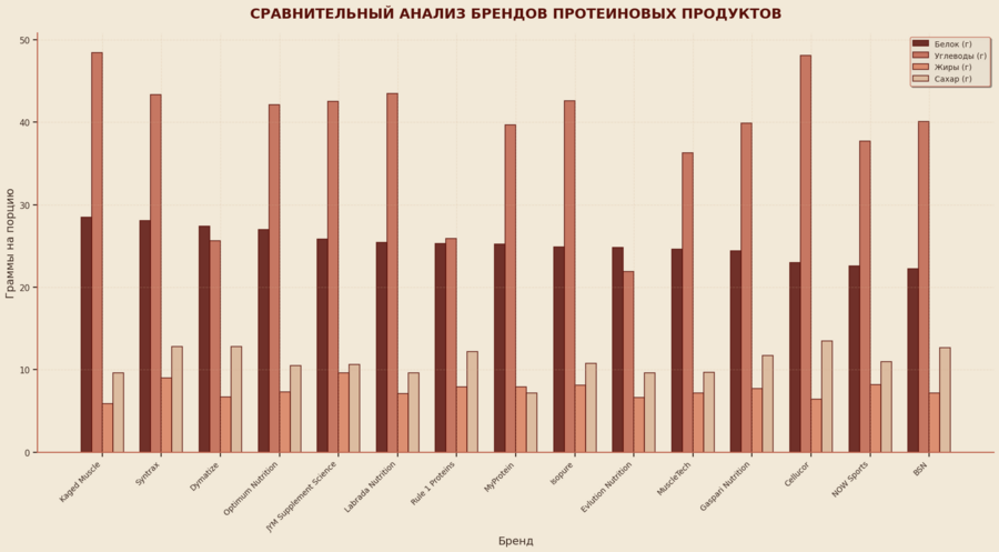 Сбалансированные: Некоторые бренды демонстрируют относительно равномерный профиль или делают акцент на низком содержании конкретного нутриента (например, сахара у MyProtein). Это указывает на стратегию работы с узкой аудиторией (следящие за составом, придерживающиеся определенных диет) или создание универсальных продуктов.