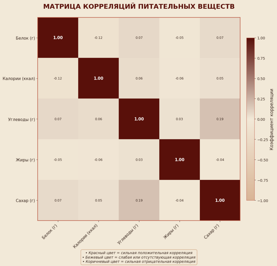 Матрица визуализирует силу и направление линейной статистической связи между 4 базовыми нутриентами (Белок, Углеводы, Жиры, Сахар) и калориями в продуктах спортивного питания.