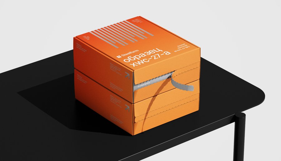Recraft: chrome-plated packaging with an orange tag on the outside and the inscription «Steelform» — контейнер