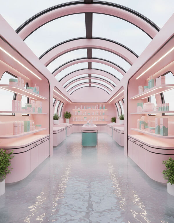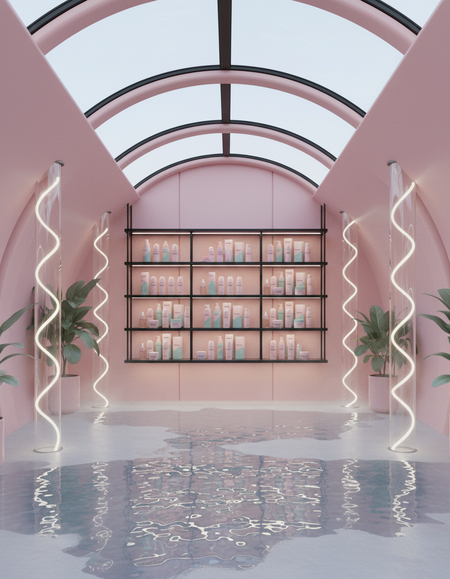 Зал с продукцией: (High-quality photo of the ELVARA retail area, designed with a minimalist, airy, and feminine premium aesthetic. The scene features shelves neatly arranged with ELVARA product boxes, illuminated by soft pastel lighting that highlights the products. The floor reflects shallow water, with a subtle mist that enhances the atmosphere. Architectural forms flow softly throughout the space, creating a luxurious, calm, and inviting mood. This modern retail space exudes sophistication, presented in a 16:9 aspect ratio with a realistic style. Incorporate elements from the product packaging references for authenticity.)