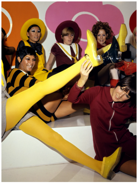 Длина юбки поднимается выше колена, а витрины бутиков на Карнаби-стрит и Кингз-роуд задают тренды в противовес образам «женщин с роскошными твердокаменными бюстами, на острых, словно стилеты, каблуках-шпильках» [7, С. 348]. Символом эпохи становится Твигги — «веточка», совсем юная британская модель, с большими глазами и короткой стрижкой, которая задала тренд на худобу и молодость.