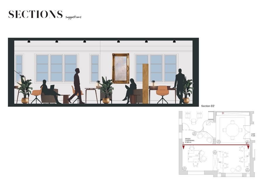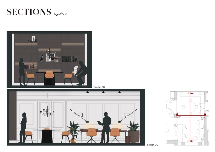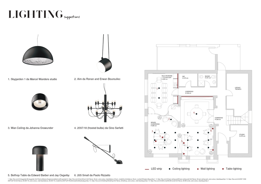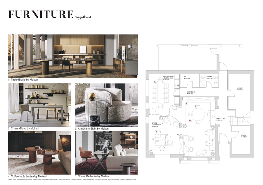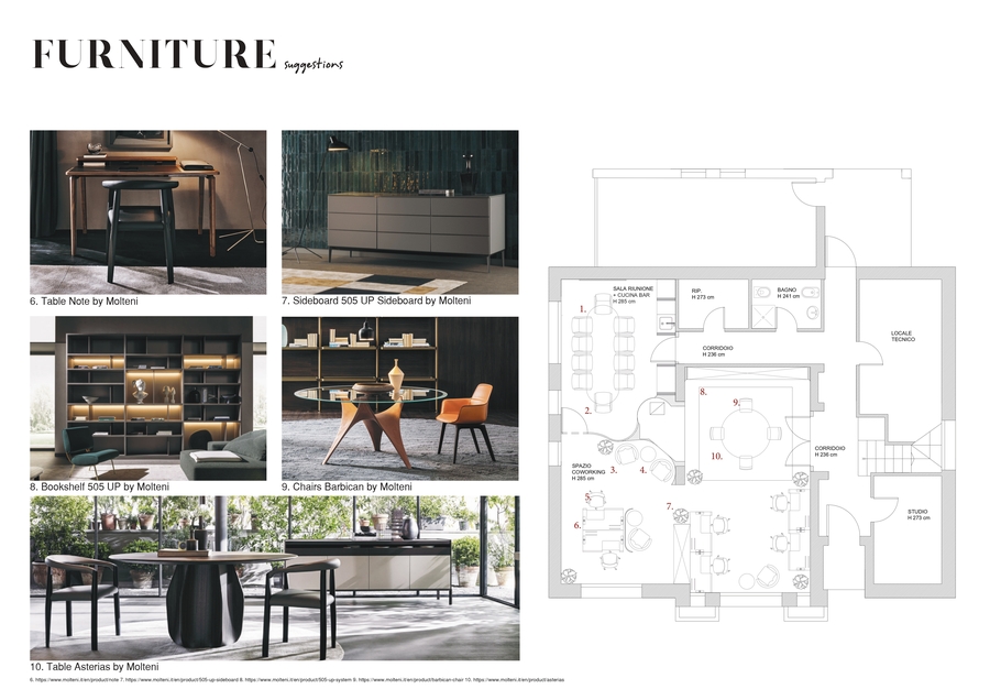 Концепция коворкинга в Милане, сегмент business/luxury. Комплектация помещения мебелью Molteni& C и освещением Flos.