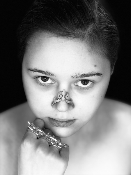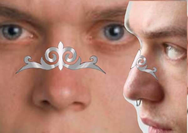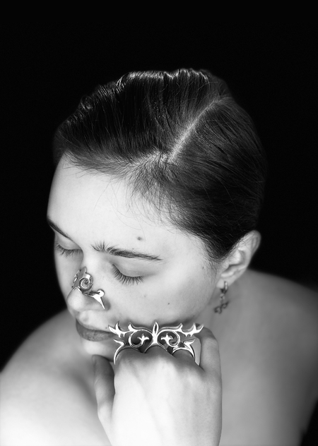 Кафф «Жауынгер» мягко облегает нос, повторяя его анатомию плавными, текучими линиями. Орнамент словно «обнимает» лицо, не утяжеляя его, а подчёркивая выразительность черт. Серебро здесь работает как вторая кожа и доспех одновременно, тонкая, но прочная. Украшение становится частью тела, а не отдельным аксессуаром.