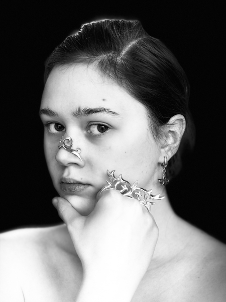 Работа над серией началась с ручных эскизов, в которых я искала баланс между декоративностью и ощущением оружия-оберега. Затем эскизы были перенесены в ювелирный воск, где форма начала обретать объём. На этапе моделирования я много работала с линией, добиваясь плавности и напряжения одновременно. После этого украшения были отлиты в серебре. Финальный этап — ручная обработка и доработка формы, когда металл окончательно «ожил» и стал цельным объектом.