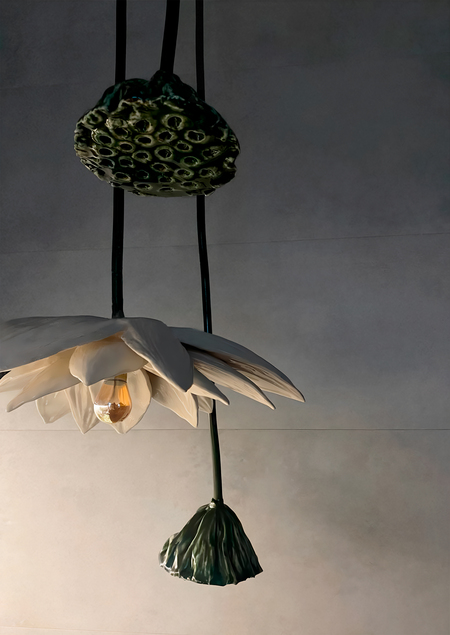 Светильники объединяют в себе декоративность и функциональность: фарфоровые лепестки пропускают тёплый свет, создавая атмосферу уюта и природной красоты. Композиция из нескольких лотосов разной высоты напоминает водную гладь, на которой цветы будто плавают, отражая идею покоя и равновесия.