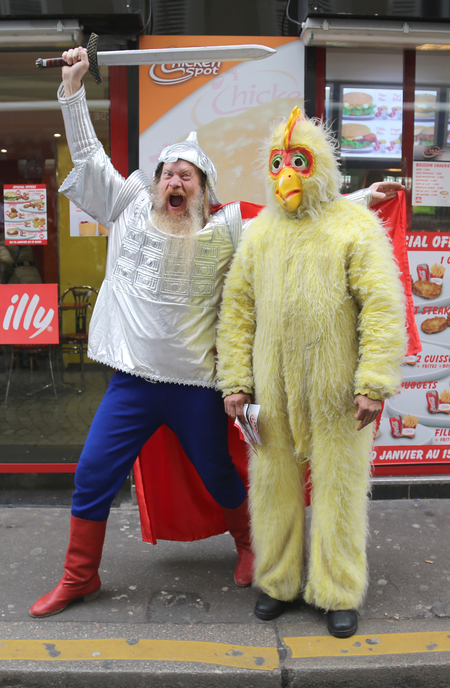 Местная пресса кошмарила граждан заголовками «Русские идут», поэтому они обрядили бородатого фотографа Евгения Иванова сказочным богатырём (в костюм с предыдущей съёмки) и пошли пугать парижан.