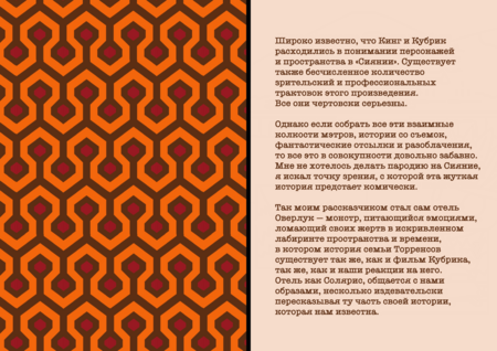 «Сияние» — это книга иллюстраций, вдохновленная романом Стивена Кинга, фильмом Стэнли Кубрика и множеством версий, трактовок и теорий, которые за эти годы сложились вокруг них.