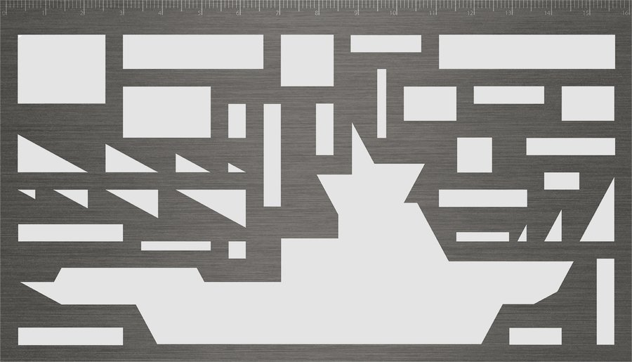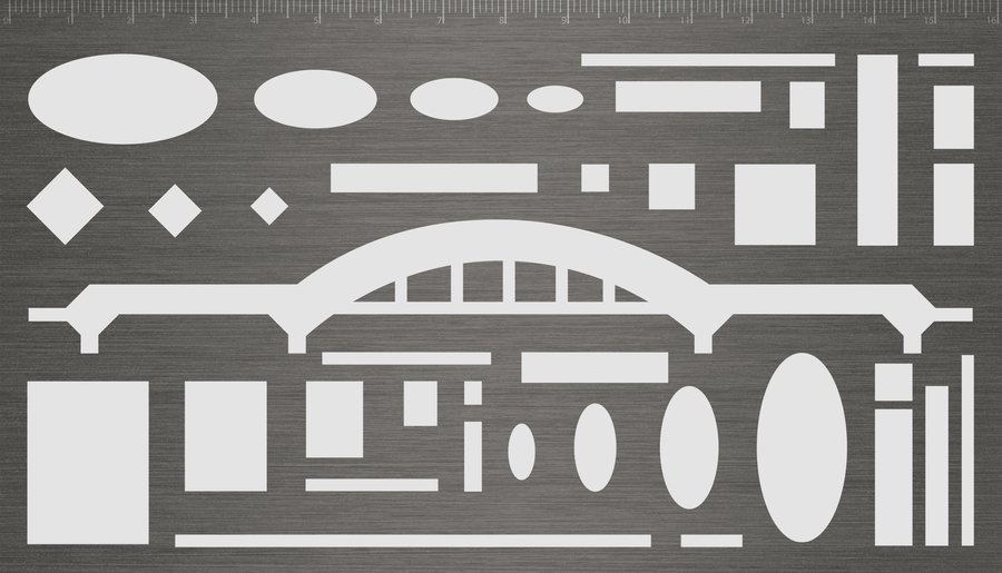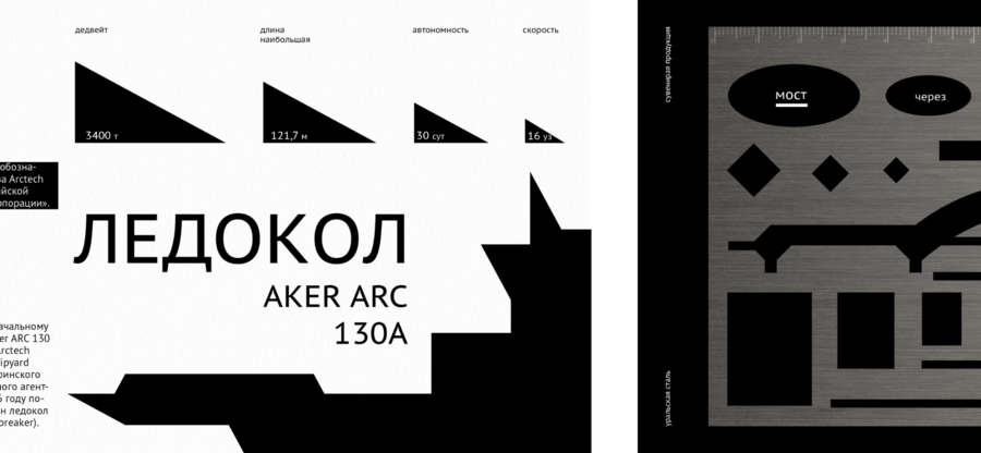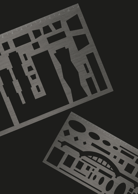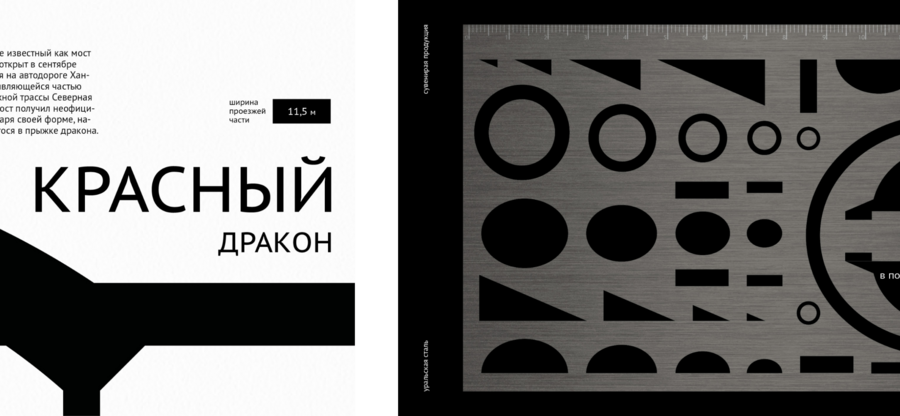Моей задачей было сделать корпоративный сувенир для компании «Уральская сталь» полезным рабочим инструментом и выразительным символом фирмы. Стальная линейка с прорезями в форме объектов, построенных с использованием материалов «Уральской Стали», становится визуально запоминающимся сувениром, напрямую связанным с реальными проектами компании.