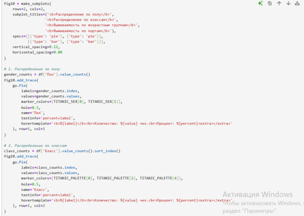 Этот тип визуализации был выбран потому, что он идеально подходит для отображения вложенных категориальных данных. Sunburst показывает, как общая выборка пассажиров делится сначала по факту выживания, затем внутри этих групп — по полу, и далее — по классу обслуживания. Это позволяет сразу увидеть пропорциональный вклад каждой подгруппы в общую картину. Статистически это представляет собой многоуровневую агрегацию данных.