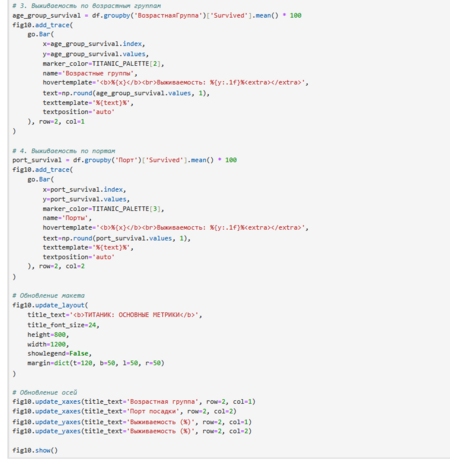 Этот сет графиков показывает основные метрики выживаемости пассажиров «Титаника» по полу, классу каюты, возрасту и порту посадки, позволяя быстро понять, какие группы людей имели больше шансов выжить