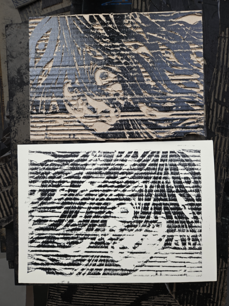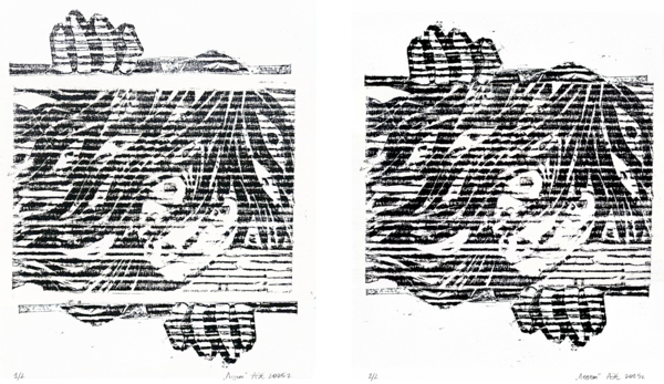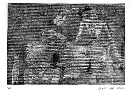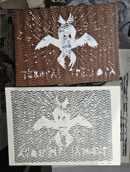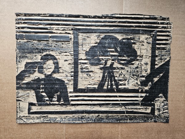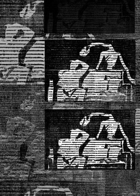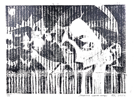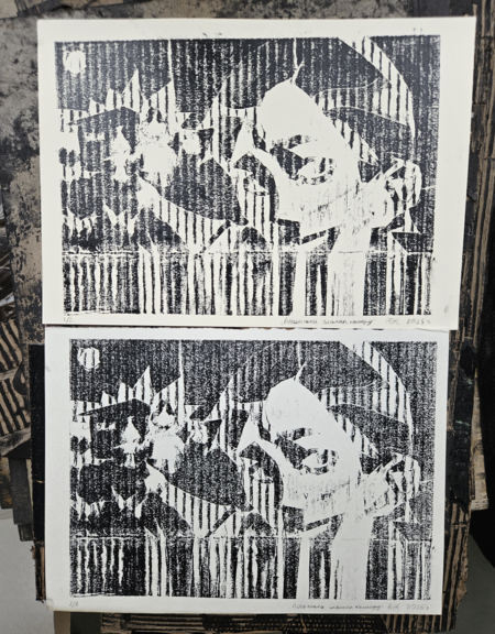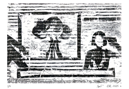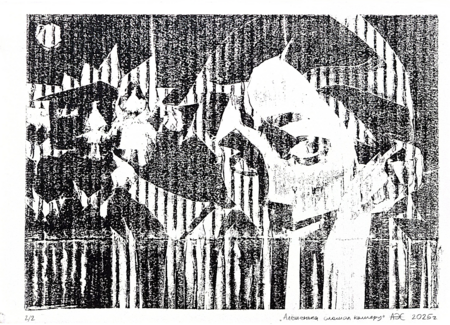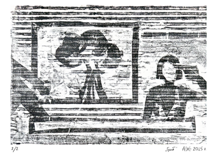 Серия из восьми гравюр на картоне на тему «Телевизионный ужас».  В этой серии работ мне хотелось немного поразмышлять над тем, какие тревожные образы можно увидеть по телевизору — мистические и более реальные, существующие и выдуманные, ностальгические и более актуальные.