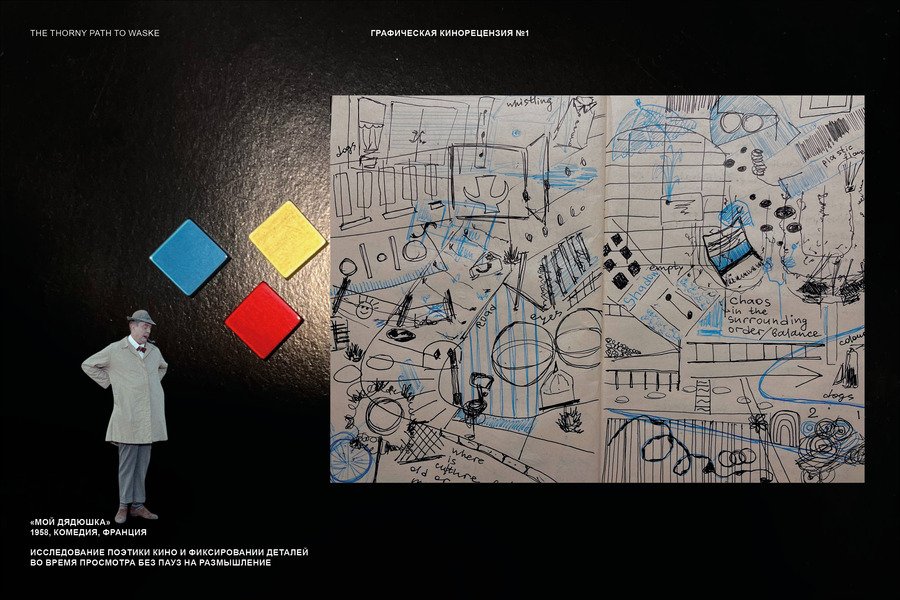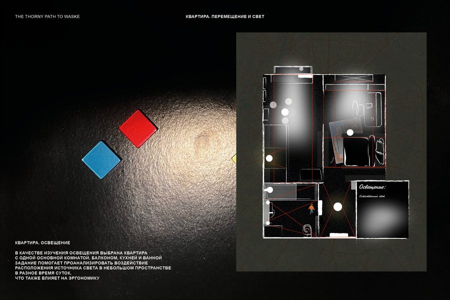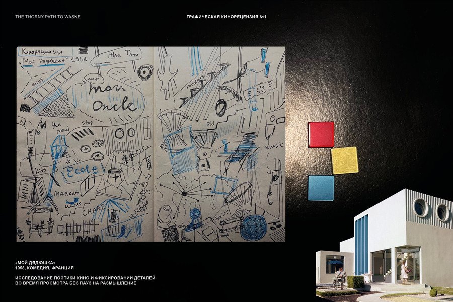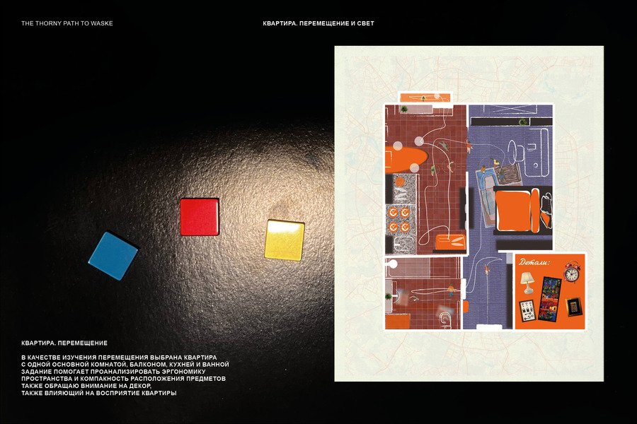 Пространство работает как карта микрокосмоса — театр внутренних процессов — эта идея прослеживается как в кинорецензиях, картах и планах перемещения, так и в масштабных разработках эргономичного мира через призму художника XX века Василия Кандинского.