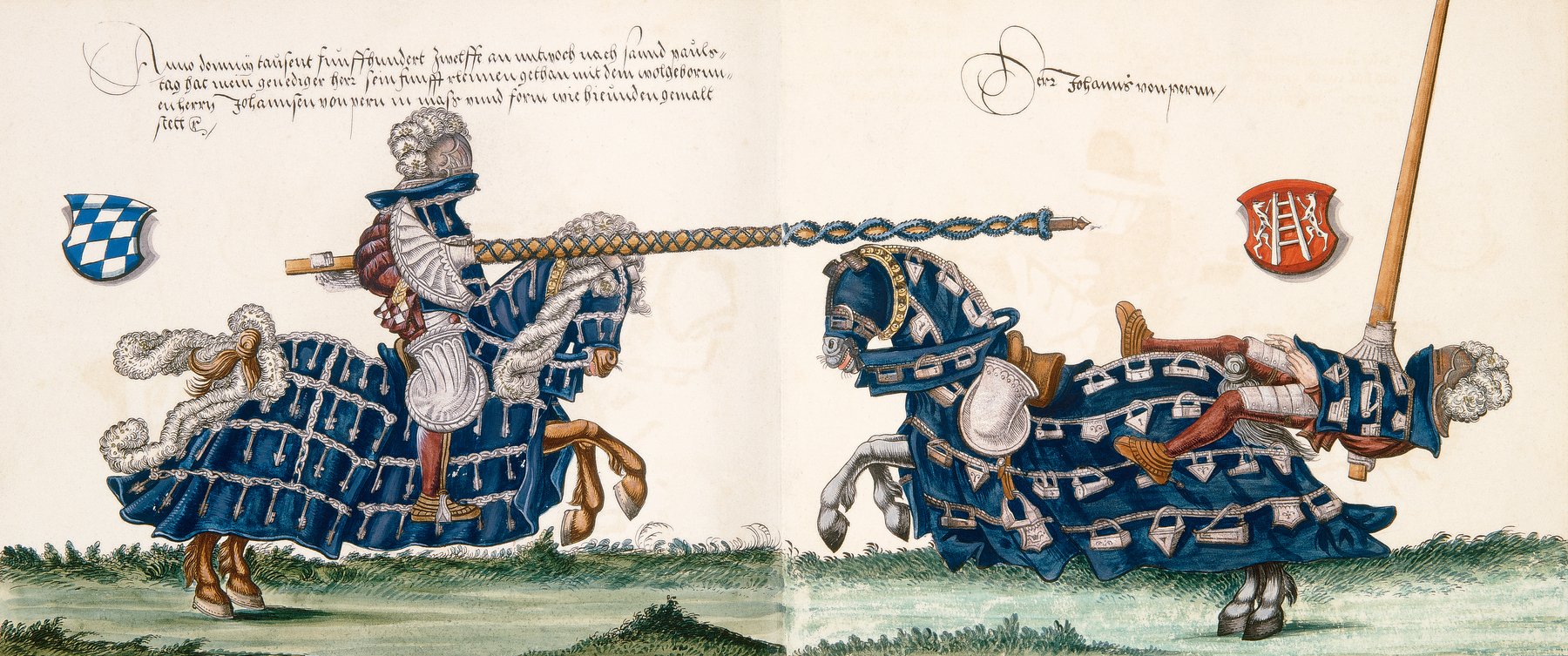 Рыцарский поединок. Гравюра из манускрипта «Турнирная книга герцога Баварии Вильгельма IV». 1544