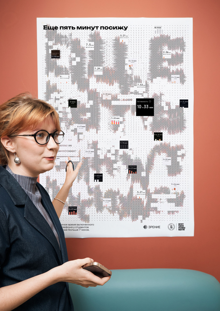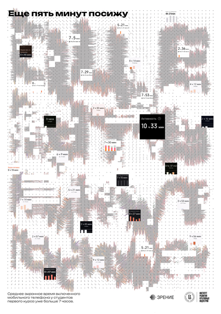 На заднем плане расположились слова «Ещё пять минут посижу». Это метафора о том, что человеку очень сложно распознать сразу как долго он сидит за экраном мобильного телефона.