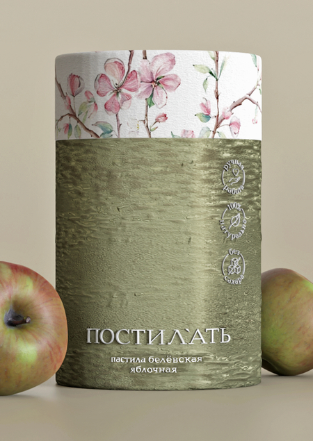 Идея упаковки подчёркивает натуральность продукта: форм-фактор тубуса отсылает к стволу яблони. Так, нижняя часть приобретает текстуру коры дерева, а верхняя символизирует цветущую крону с плодами