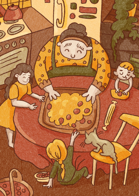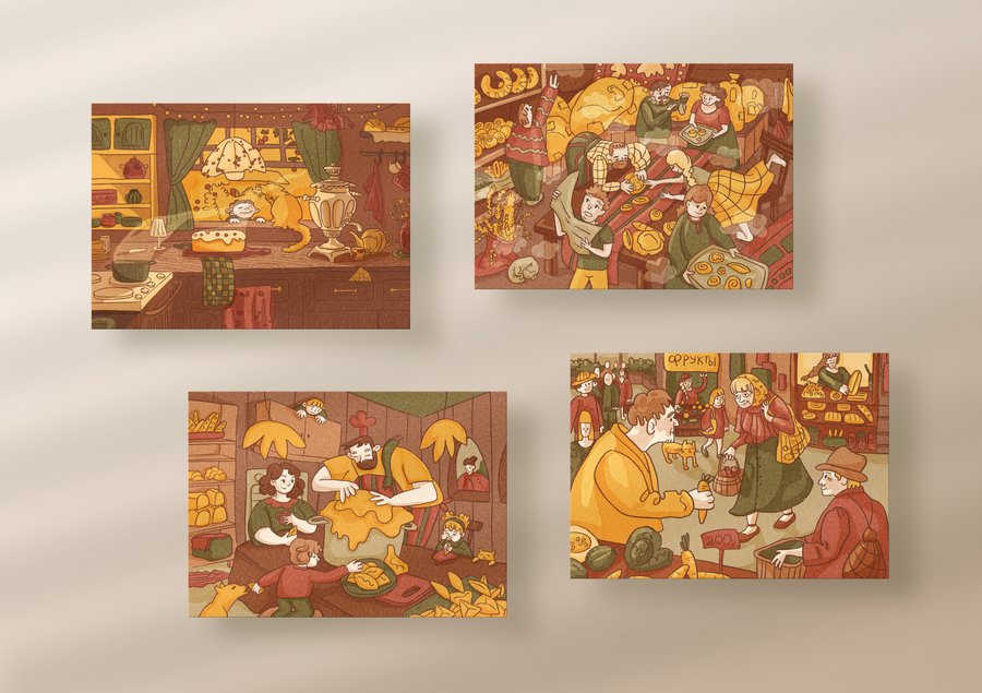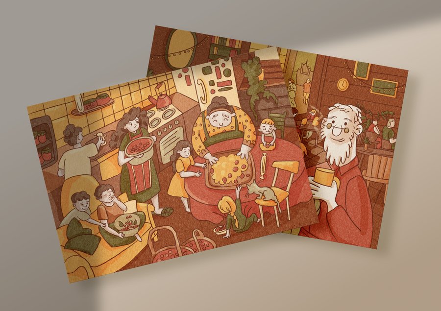 Серия открыток о домашнем уюте, семейных традициях и выпечке. Вдохновением для меня послужили собственные воспоминания семейных кулинарных вечеров, когда приготовление и аромат домашней выпечки объединяли нас. Проект ориентирован на любителей кулинарии и семейных ценностей.