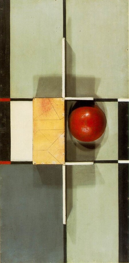 Примеры упрощённых геометрических фигур и цветовых плоскостей, перекликающиеся с искусством Баухауса и позднего кубизма