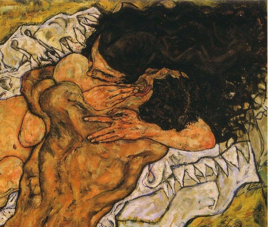 1. Эгон Шиле «„Автопортрет с поднятым голым плечом“, 1912 2. Эгон Шиле „Объятия (Любовники)“, 1917