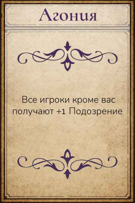 Игроки покупают карты Агонии из магазина за две фишки Подозрений (берут в руку). Каждый раунд карты в магазин докладываются.